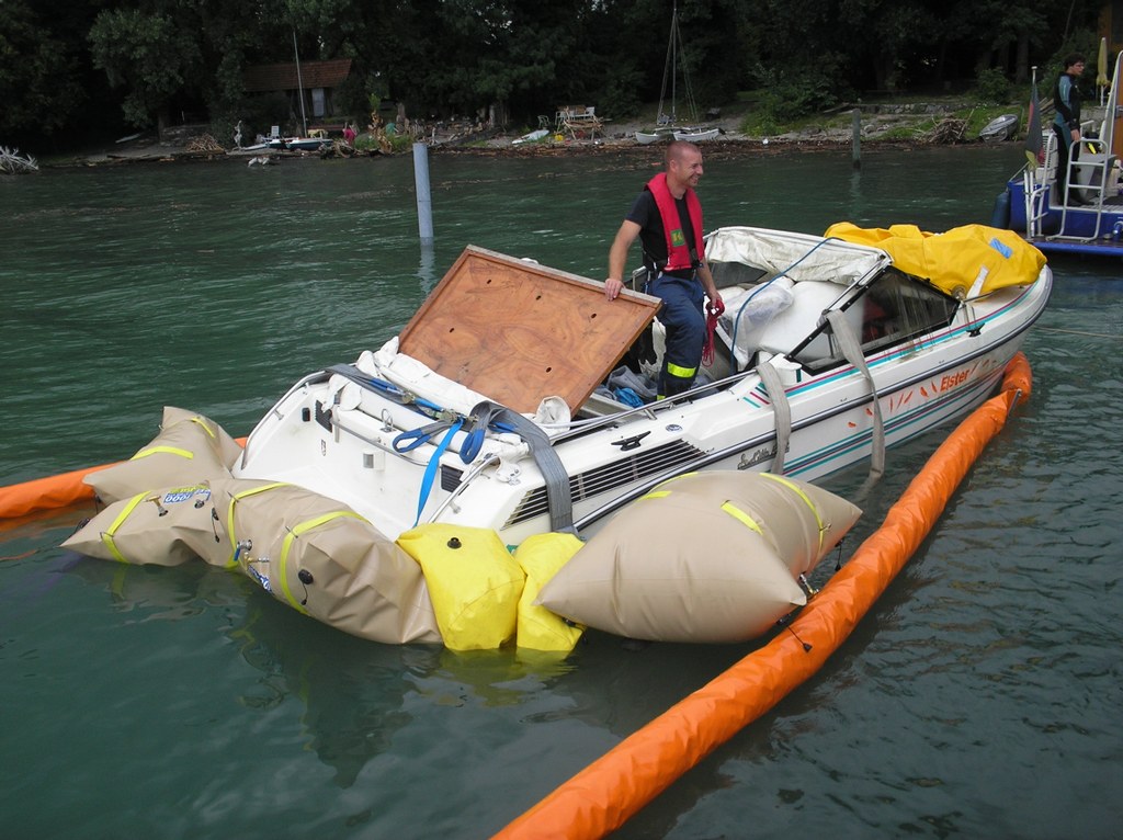 Vor Ort stellte sich heraus das ein Motorboot an der Boje befestigt gesunken war, die Wasserwacht Lindau war bereits mit dem Rettungsboot Seewolf vor Ort. Da Öl und Benzin austrat und somit eine Gewässerverschmutzung drohte wurde mittels dem Wasserburger Feuerwehrboot eine Ölsperre um die Schadensstelle gelegt um eine Ausbreitung zu verhindern. Nachdem das THW Lindau noch weitere Hebesäcke geliefert hatte wurde das Boot durch die Taucher der Wasserwacht gehoben und gemeinsam durch Wasserwacht und Feuerwehr ausgepumpt.