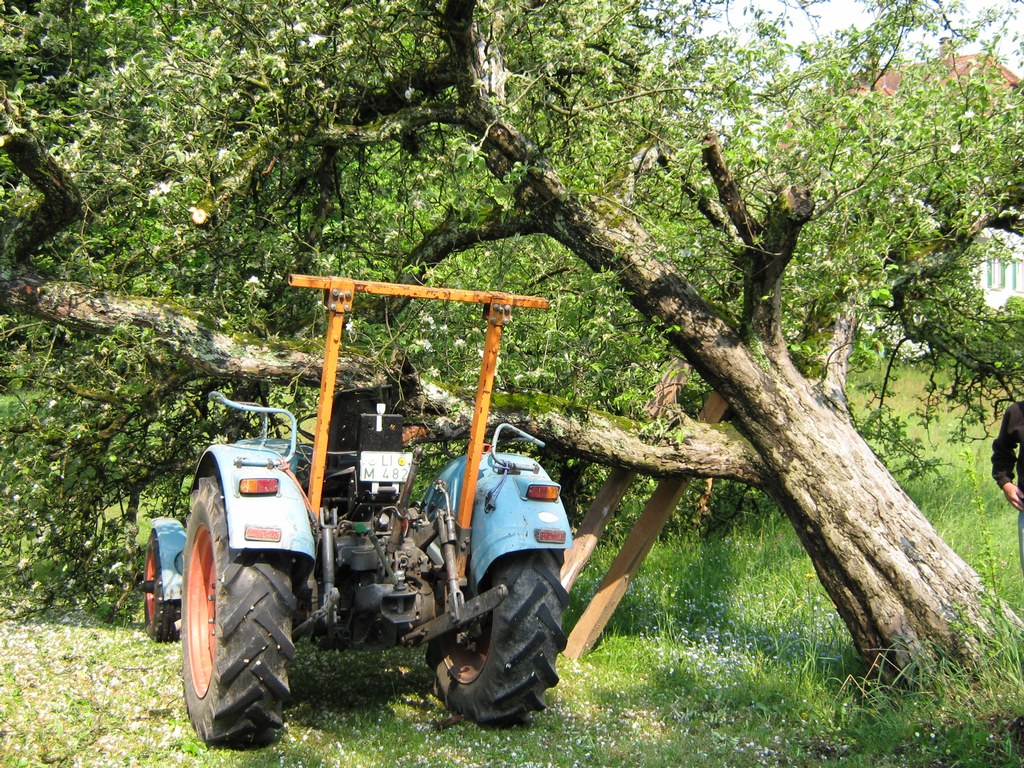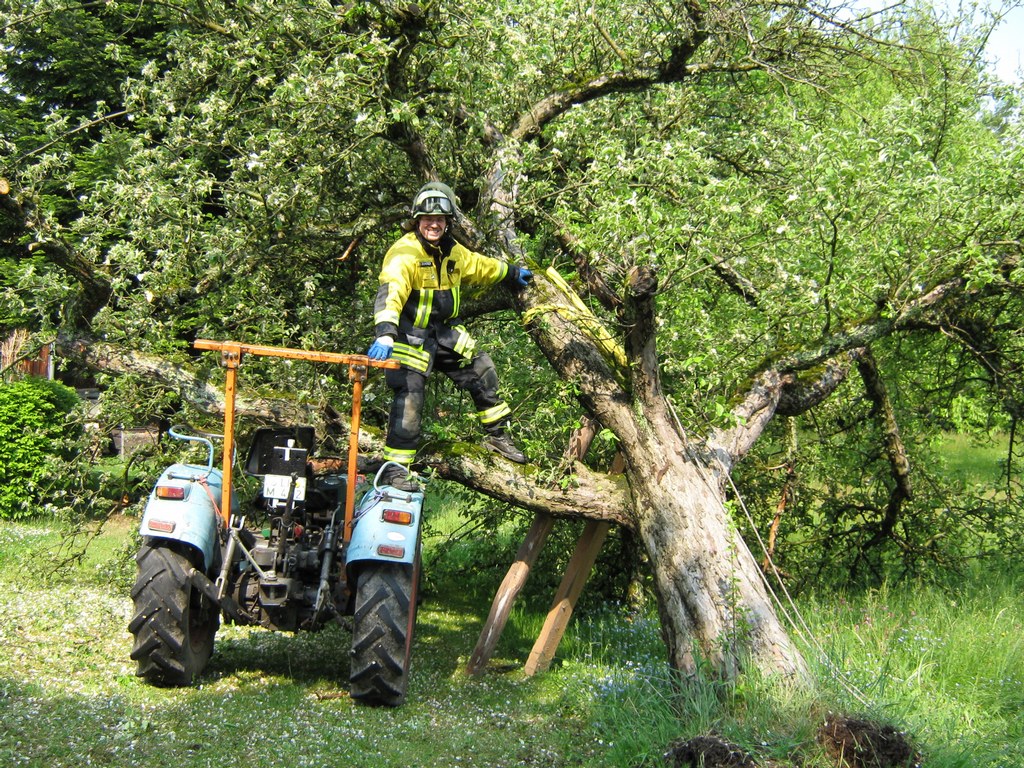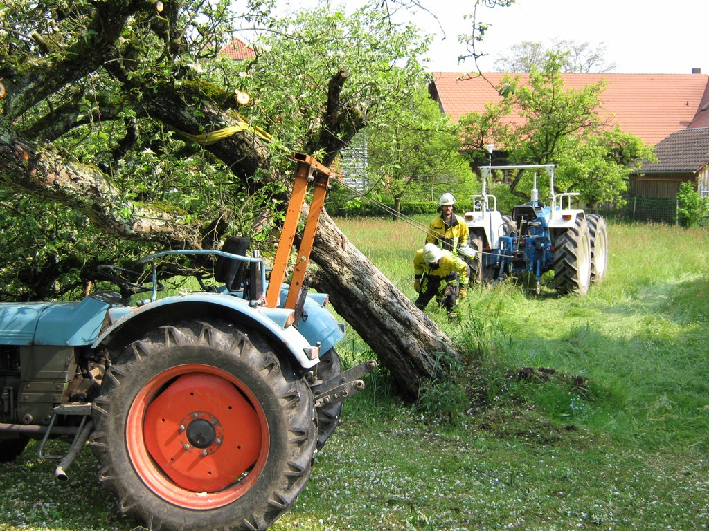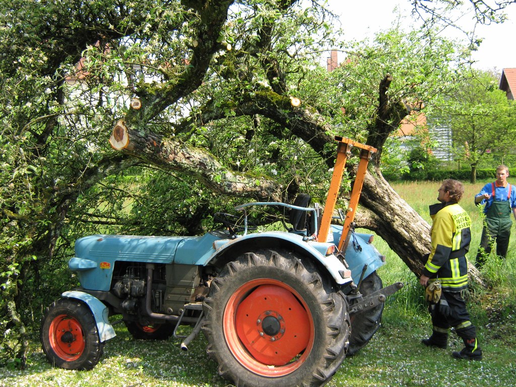 Zu einem ungewöhnlichen Einsatz wurden wir heute gerufen. Ein Traktor ist mit dem Sturzbügel/Überrollbügel beim vorbeifahren an einem alten Hochstamm hängen geblieben. Darauf hin stürzte der Baum um und viel auf den Traktor. Geistesgegenwärtig ist der Fahrer (auch ein Feuerwehrkamerad von uns) vom Sitz gesprungen, sonst hätte er sicherlich Verletztungen davon getragen.