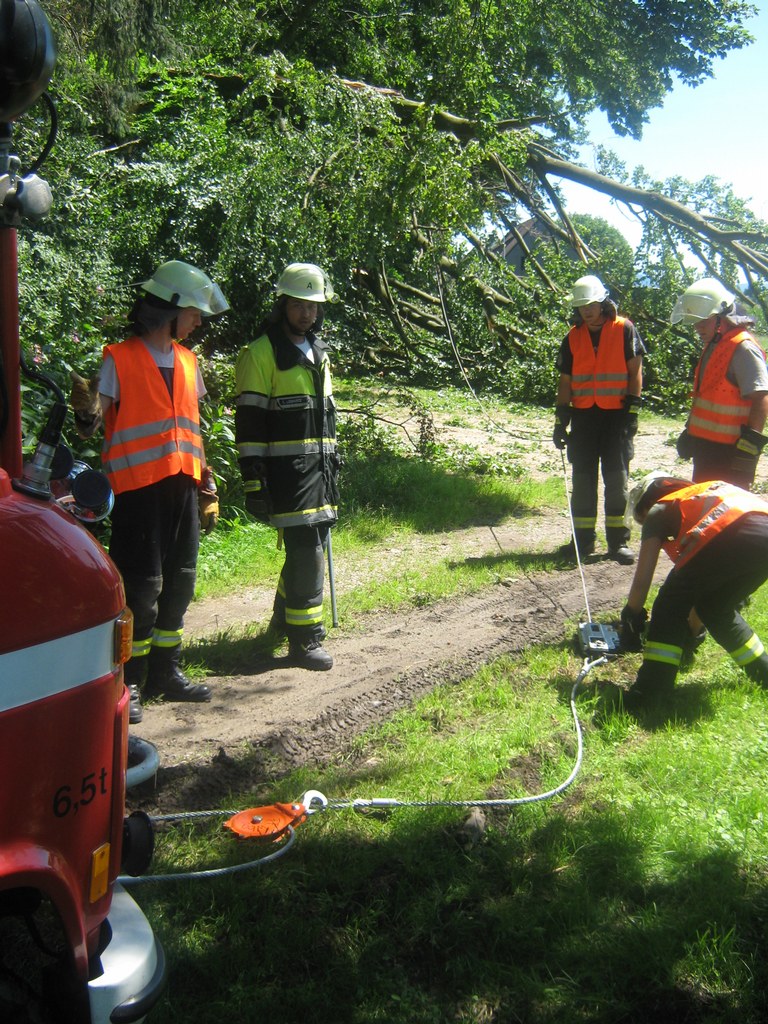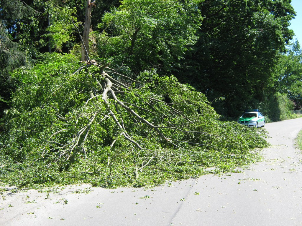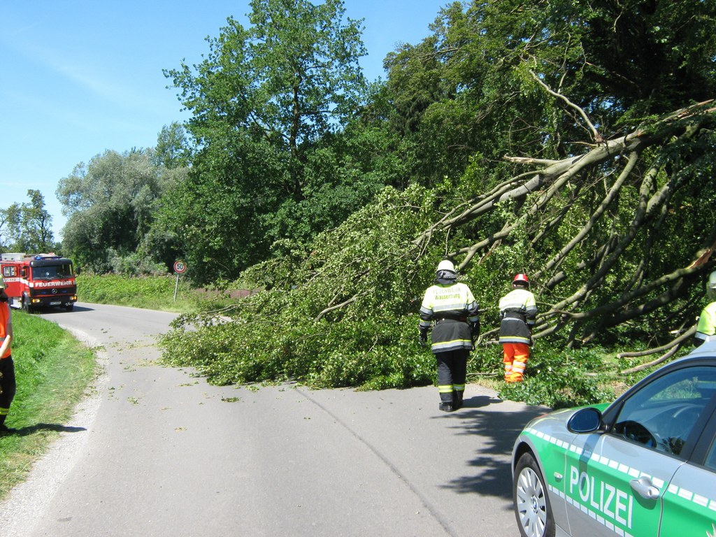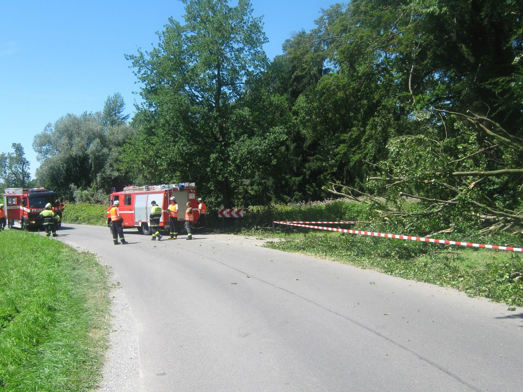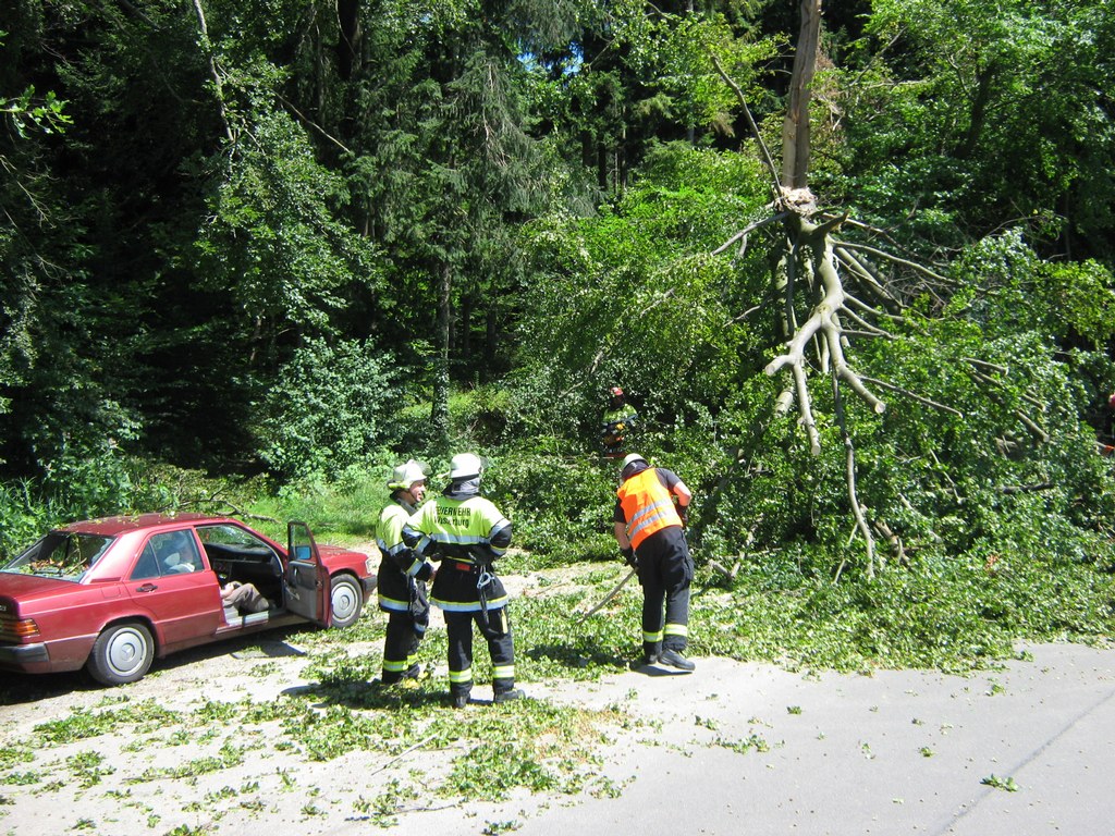 Heute, am Sonntag 26. Juli wurden wir um 12:12 Uhr alarmiert, weil ein Baum über eine Straße gefallen ist und diese blockiert hat. An der Einsatzstelle angekommen stellte sich heraus, dass der Baum auf einen parkenden PKW gestürzt ist. Die zwei Insassen hatten sehr viel Glück, so dass nur am PKW Schaden entstanden ist. Dieser wurde stark beschädigt.