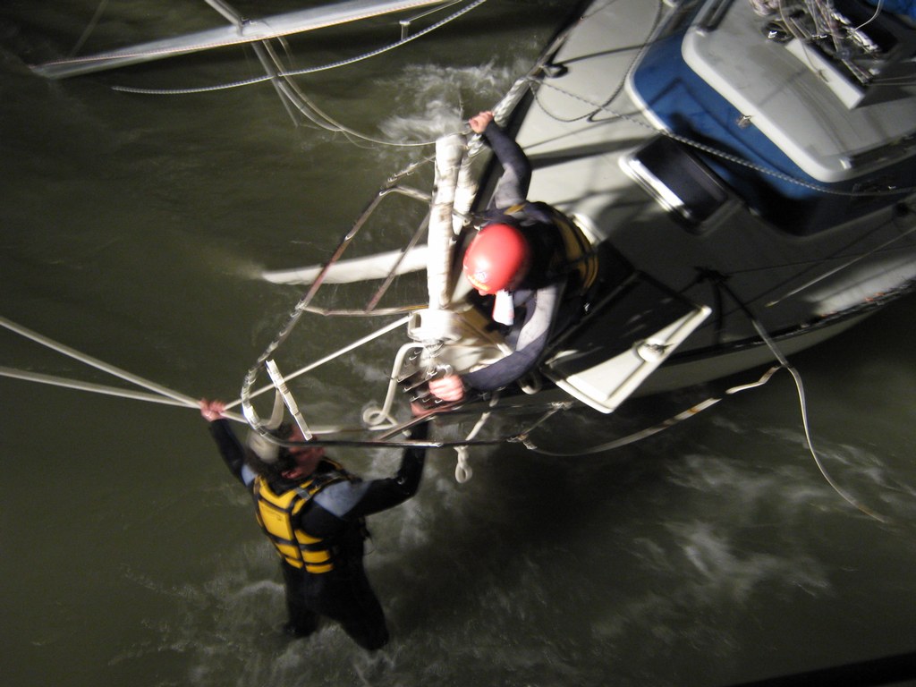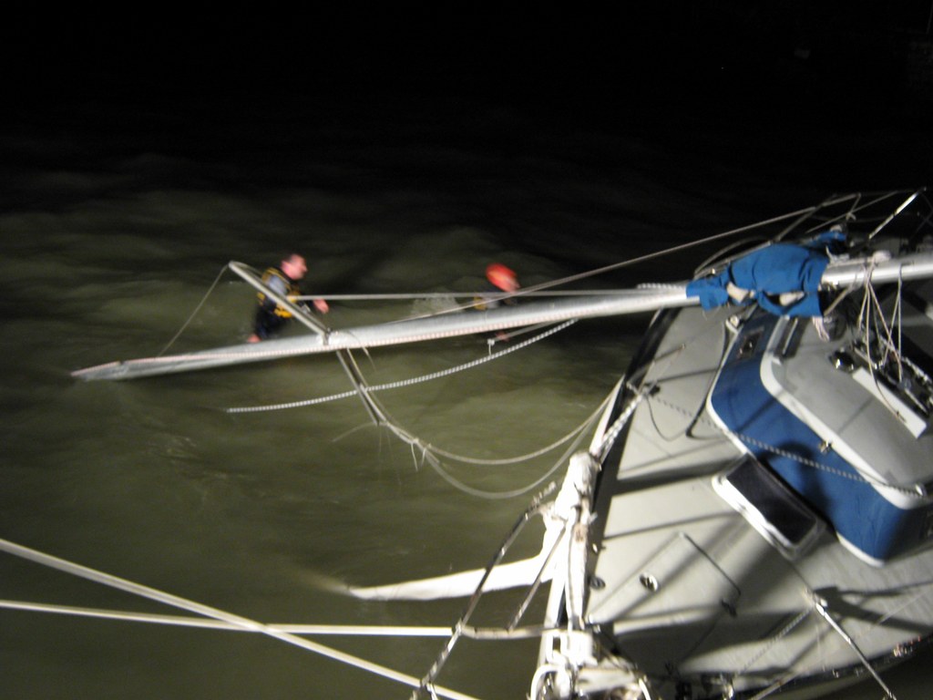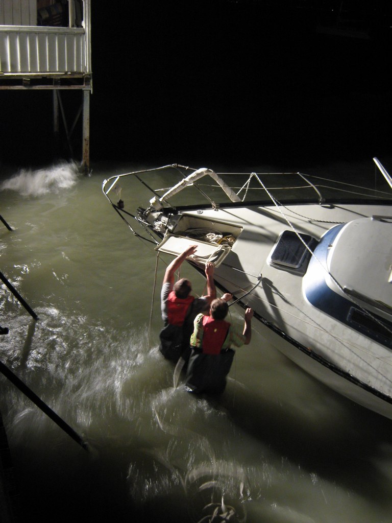 Zuerst leuchteten wir die Einsatzstelle komplett aus, dann sicherten wir die Yacht, damit diese nicht noch weiter beschädigt wird. Seeseitig passierte dies über die beiden Anker und einer langen Leine, die von den Schwimmern der Wasserwacht an einer freien Boje befestigt wurde. Landseitig sicherten wir die Yacht über unseren Greifzug. Somit war gewährleistet, daß die Yacht nicht weiter auf das angrenzende Badehäusle und dessen Steg treibt und hier etwas beschädigt.