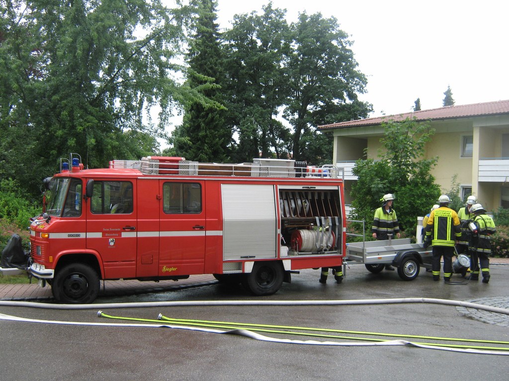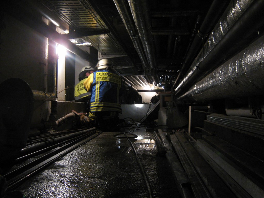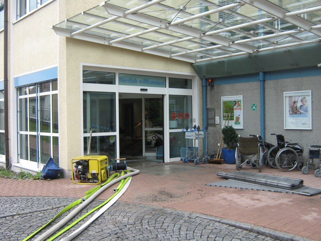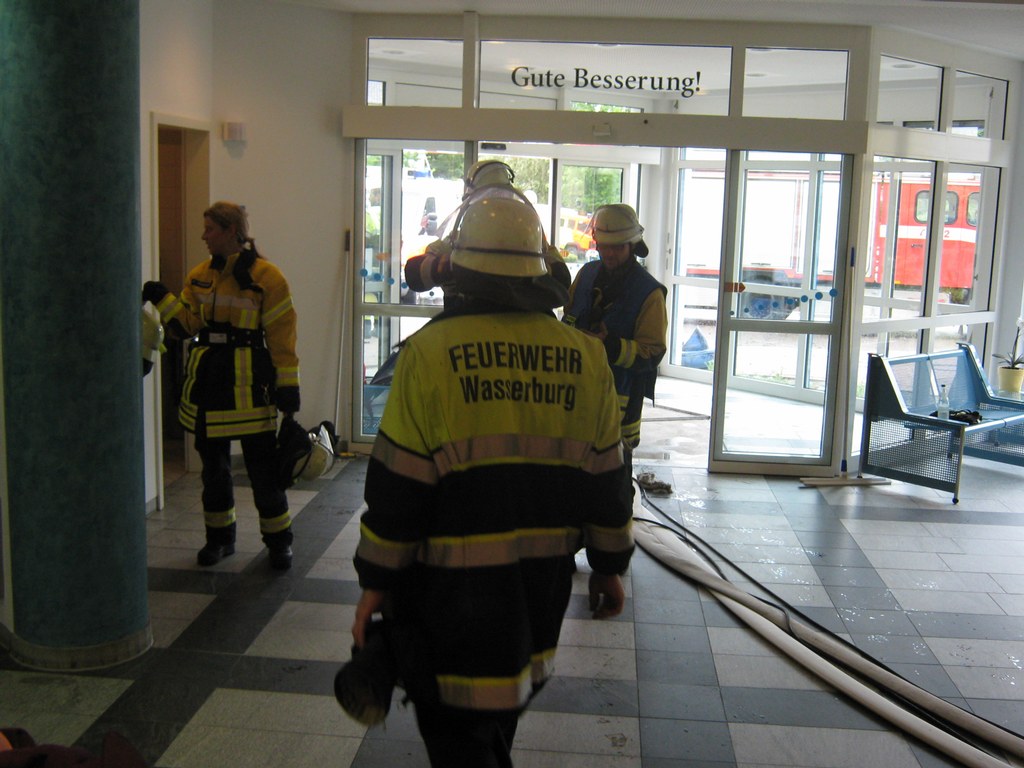 Schon auf der Anfahrt wurde uns der Abschnitt Krankenhaus Lindau zugeteilt und unterstellt, beide Fahrzeuge nahmen unverzüglich mit allen zur Verfügung stehenden Tauchpumpen und der TS 8/8 die Pumparbeiten in diversen Technikräumen im Keller auf. Zusätzlich wurde durch den Abschnittleiter ein weiteres Löschgruppenfahrzeug der Feuerwehr Lindau dazu alarmiert das mit unterstützte. In langwieriger Arbeit und mit teilweiser Unterstützung durch Krankenhauspersonal wurde der Wasserstand bald gesenkt so das keine weitere Gefahr mehr für die Elektroveteilung und die Heizanlage bestand. Desweiteren wurde ein Aufzugschacht leer gepumpt. Auch KBR Schneider und Landrat Stegmann machten sich vor Ort ein Bild von der Lage.