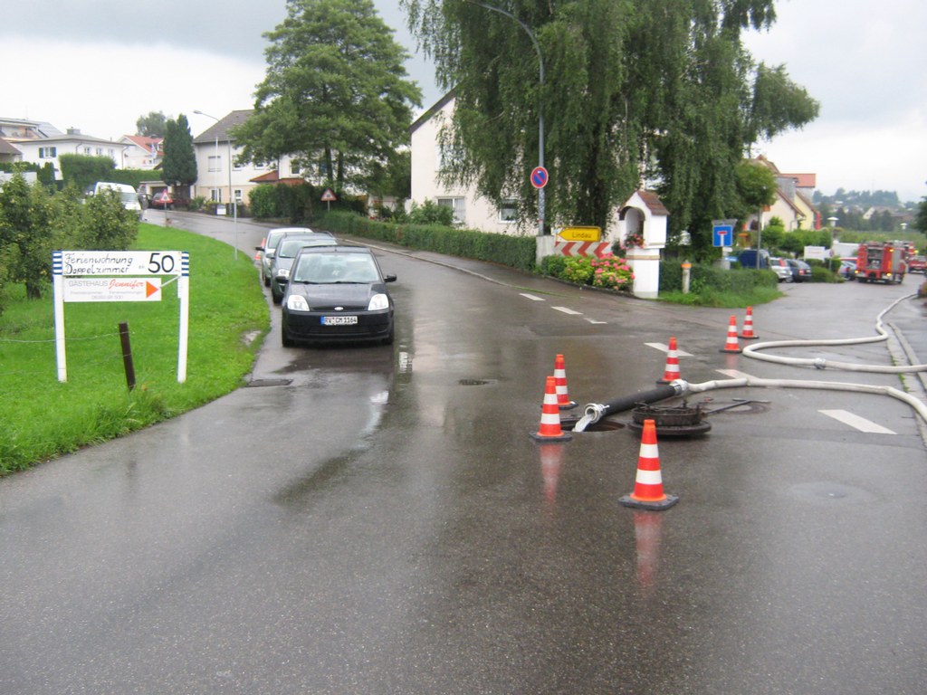 Am Freitag, 6.8. morgens um 6.30 wurde die Feuerwehr Wasserburg erneut alarmiert. Im Tiefen Brunnen in Wasserburg lief eine Tiefgarage durch einen nicht mehr ablaufenden Kanal voll. Die Kanalisation in diesem Bereich konnte die Wassermassen, die seit Donnerstag gefallen waren, nicht mehr verarbeiten und so füllte sich die Garage zusehends.
