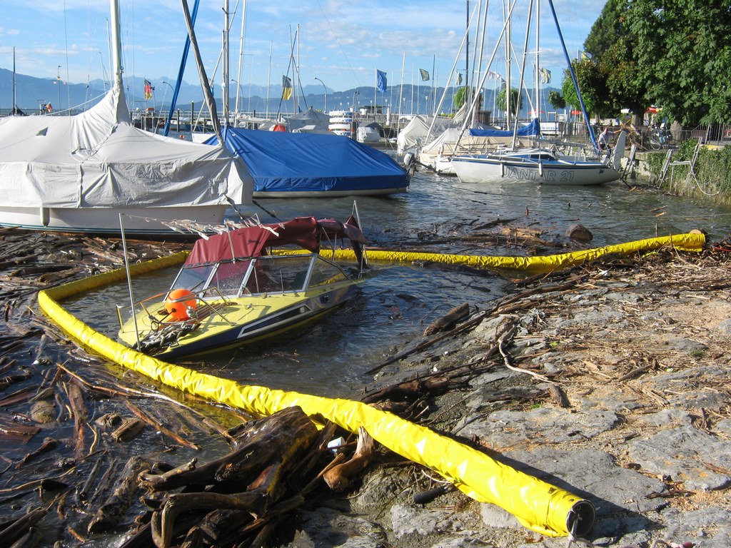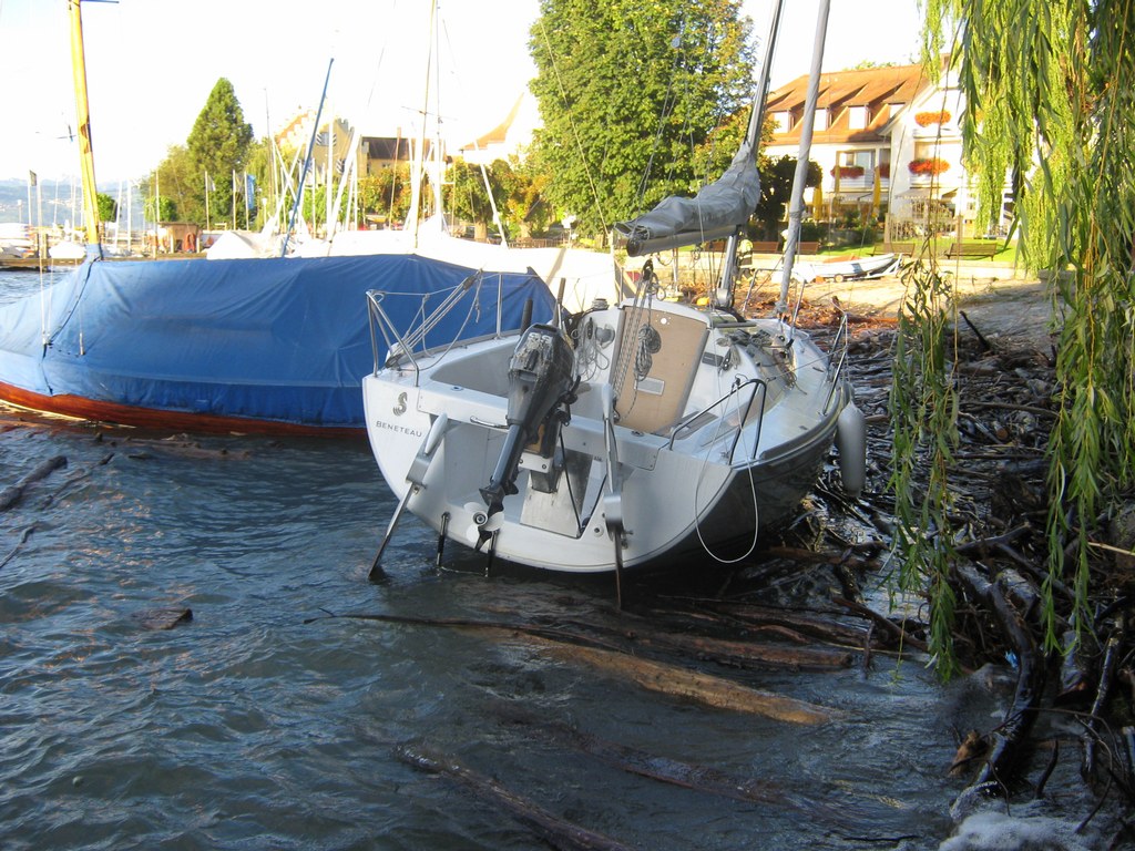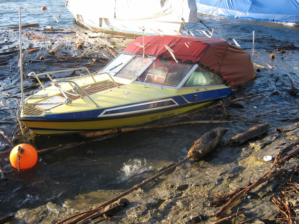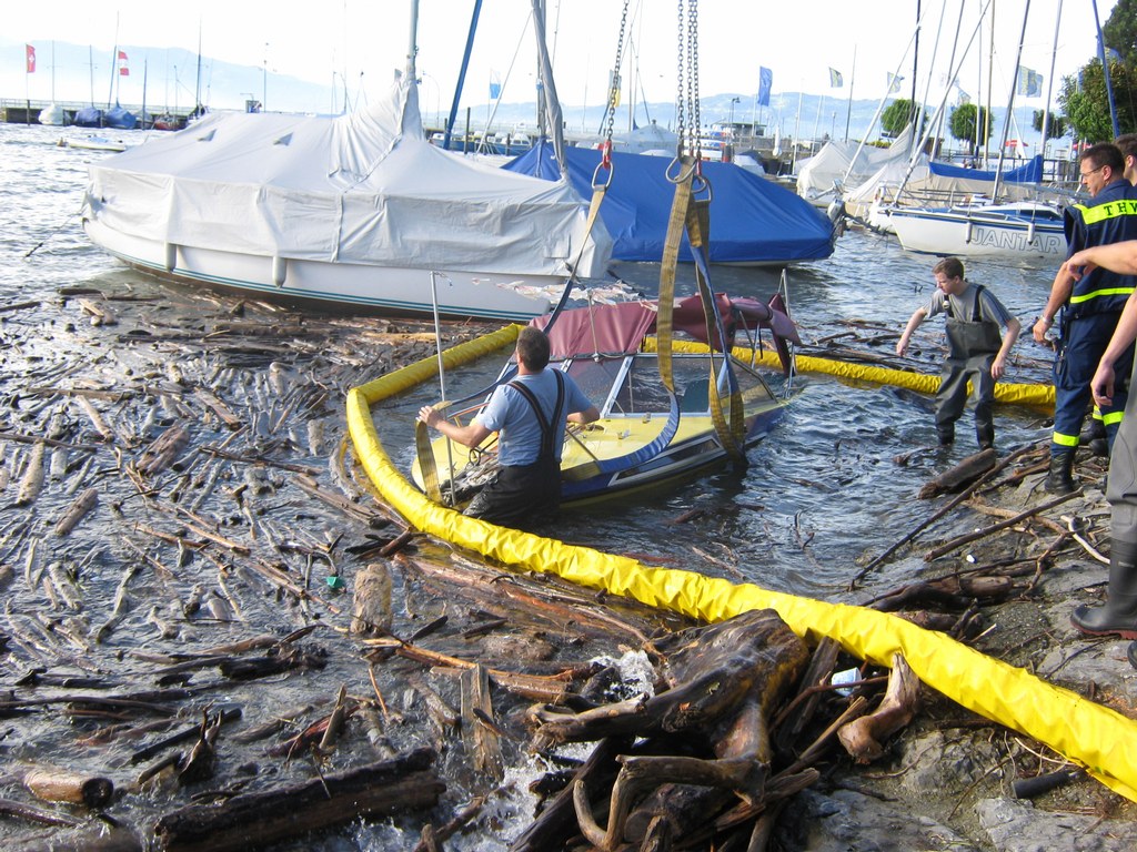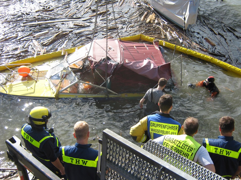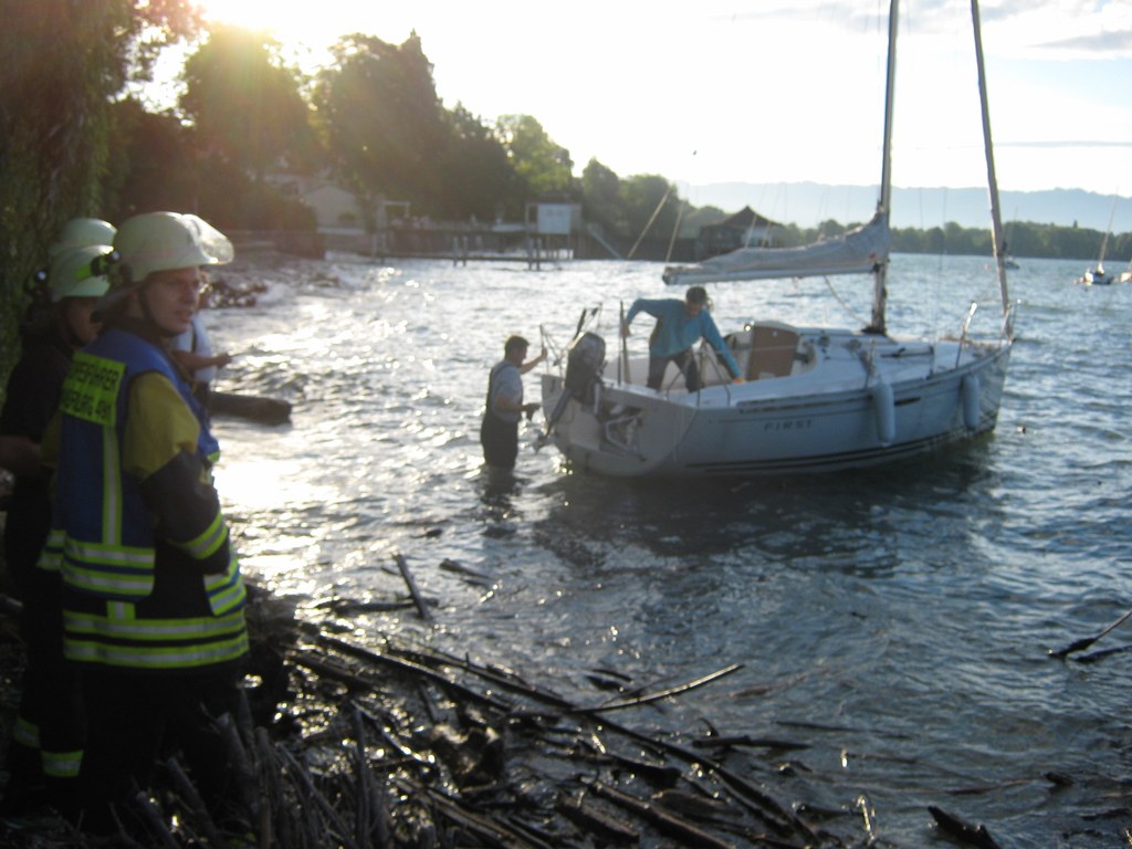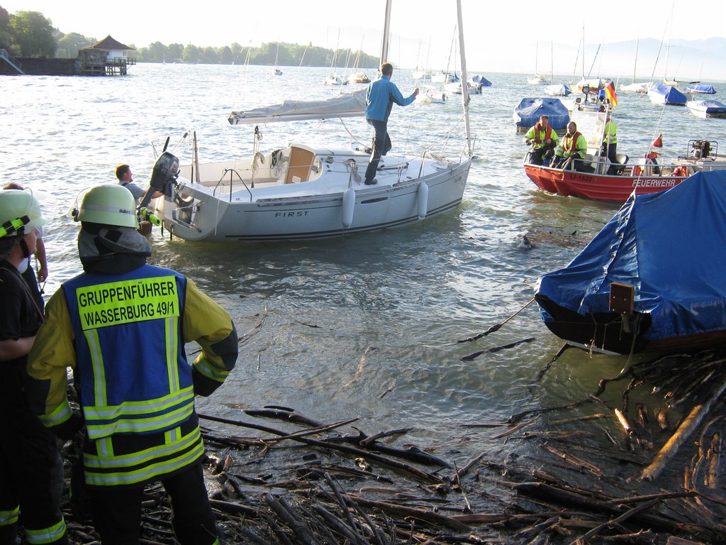 Beim zweiten Boot, einem Motorboot, gestaltete sich die Bergung schwieriger, es war vollgelaufen und auf Grund gesunken, dazu noch trat Motoröl und Kraftstoff aus. Die Feuerwehr Wasserburg errichtete eine Ölsperre rund um das Boot, vom Einsatzleiter der Feuerwehr wurde ein Fahrzeug mit Kran des THW Lindau angefordert. In gemeinsamer Arbeit von Feuerwehr Wasserburg und THW Lindau wurde das Boot dann leer gepumpt und mit dem Kran gehoben, im Laufe der Bergung stellte sich dann schnell heraus das der Rumpf durch den Aufschlag auf das Ufer in der Nacht beschädigt war. Das Motorboot wurde sichergestellt und vom THW in eine Kressbronner Werft transportiert. Die ausgetretenen Betriebsstoffe wurden von der Feuerwehr Wasserburg aufgenommen und die Ölsperre wieder abgebaut, nach gut 3 Stunden war der Einsatz beendet. Die Schadenshöhe wird von der Wasserschutzpolizei ermittelt.