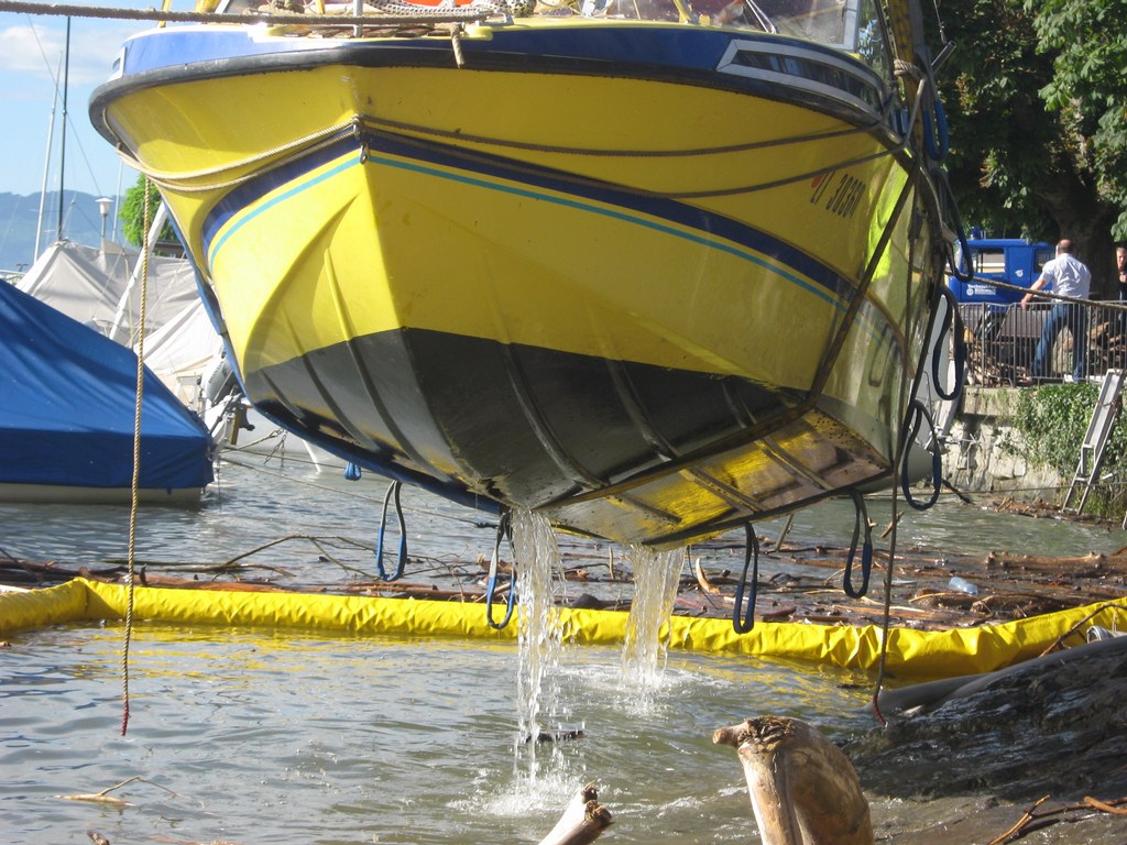 Beim zweiten Boot, einem Motorboot, gestaltete sich die Bergung schwieriger, es war vollgelaufen und auf Grund gesunken, dazu noch trat Motoröl und Kraftstoff aus. Die Feuerwehr Wasserburg errichtete eine Ölsperre rund um das Boot, vom Einsatzleiter der Feuerwehr wurde ein Fahrzeug mit Kran des THW Lindau angefordert. In gemeinsamer Arbeit von Feuerwehr Wasserburg und THW Lindau wurde das Boot dann leer gepumpt und mit dem Kran gehoben, im Laufe der Bergung stellte sich dann schnell heraus das der Rumpf durch den Aufschlag auf das Ufer in der Nacht beschädigt war. Das Motorboot wurde sichergestellt und vom THW in eine Kressbronner Werft transportiert. Die ausgetretenen Betriebsstoffe wurden von der Feuerwehr Wasserburg aufgenommen und die Ölsperre wieder abgebaut, nach gut 3 Stunden war der Einsatz beendet. Die Schadenshöhe wird von der Wasserschutzpolizei ermittelt.