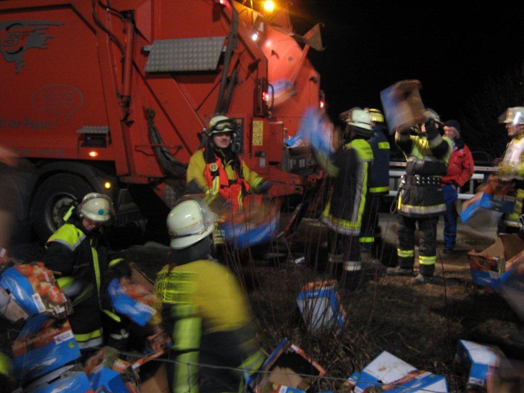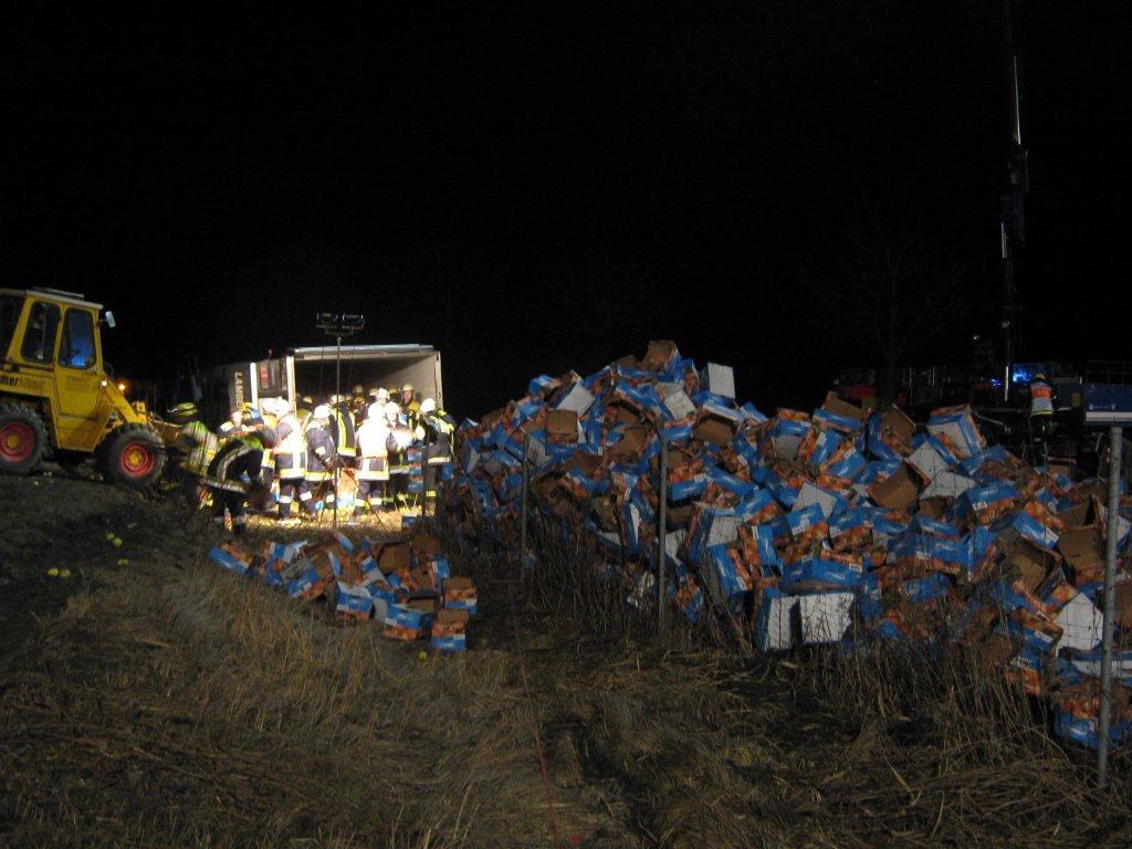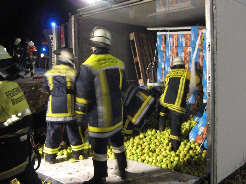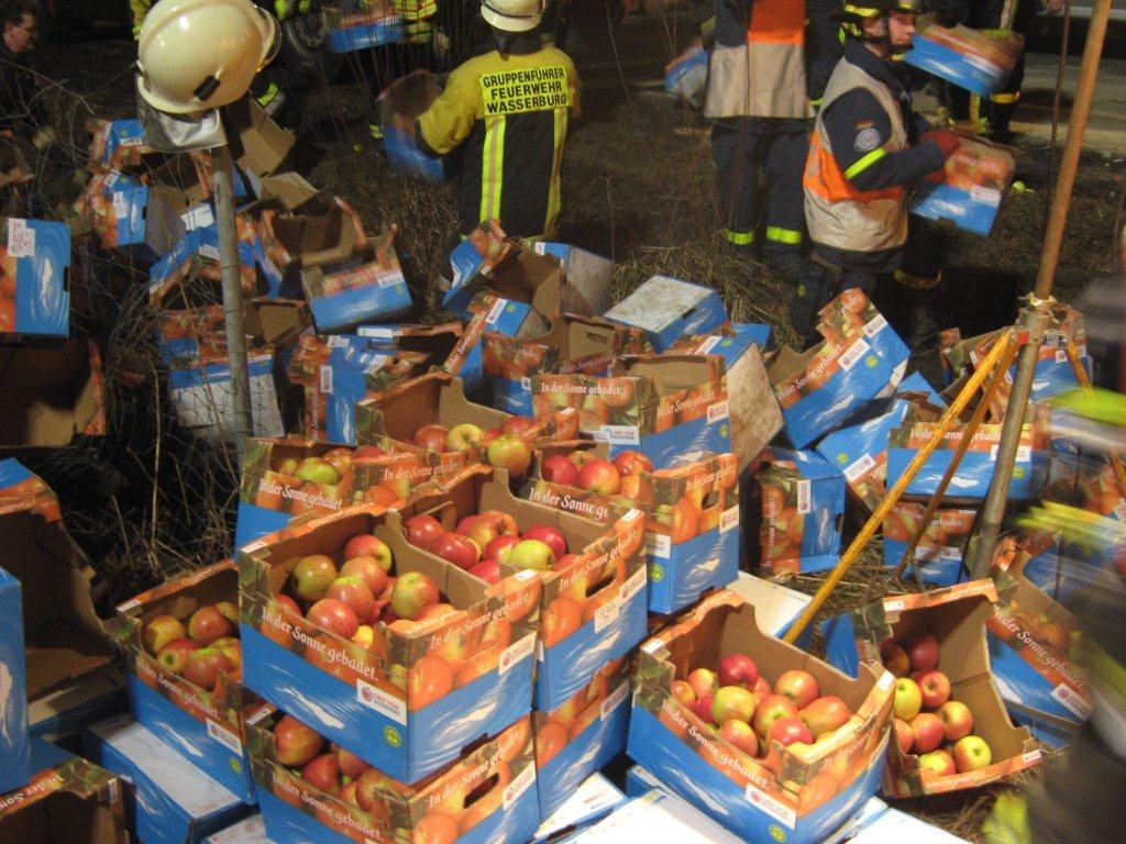 Für die Bergungsarbeiten ist die B31 bis auf Weiteres total gesperrt. Lindaus Kommandant Robert Kainz geht davon aus, dass die Bergungsarbeiten mindestens bis Mitternacht dauern werden. Feuerwehren aus Lindau und Wasserburg, THW und andere Helfer müssen 21 Tonnen Äpfel aus dem Laster laden, bevor sie ihn mit Hilfe eines Krans aufrichten können. Da einige hundert Liter Diesel ausgelaufen sind, steht zudem noch nicht fest, ob zusätzlich das Erdreich ausgebaggert werden muss.