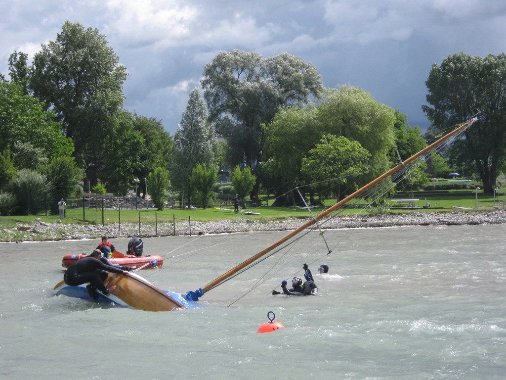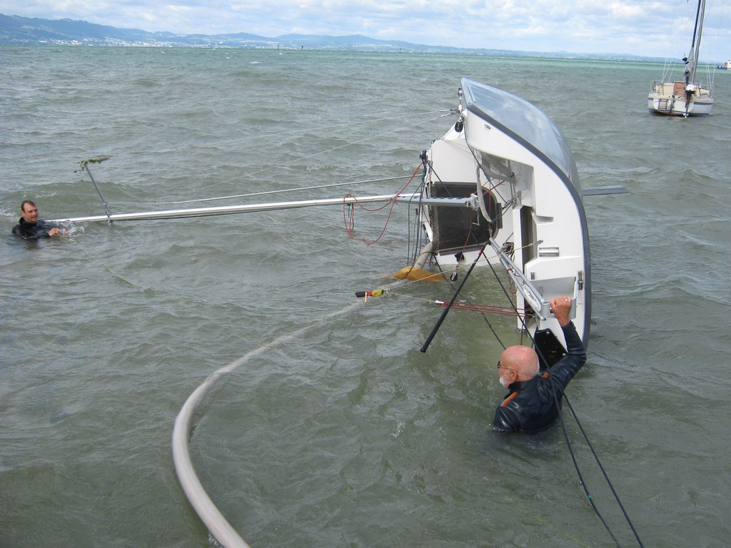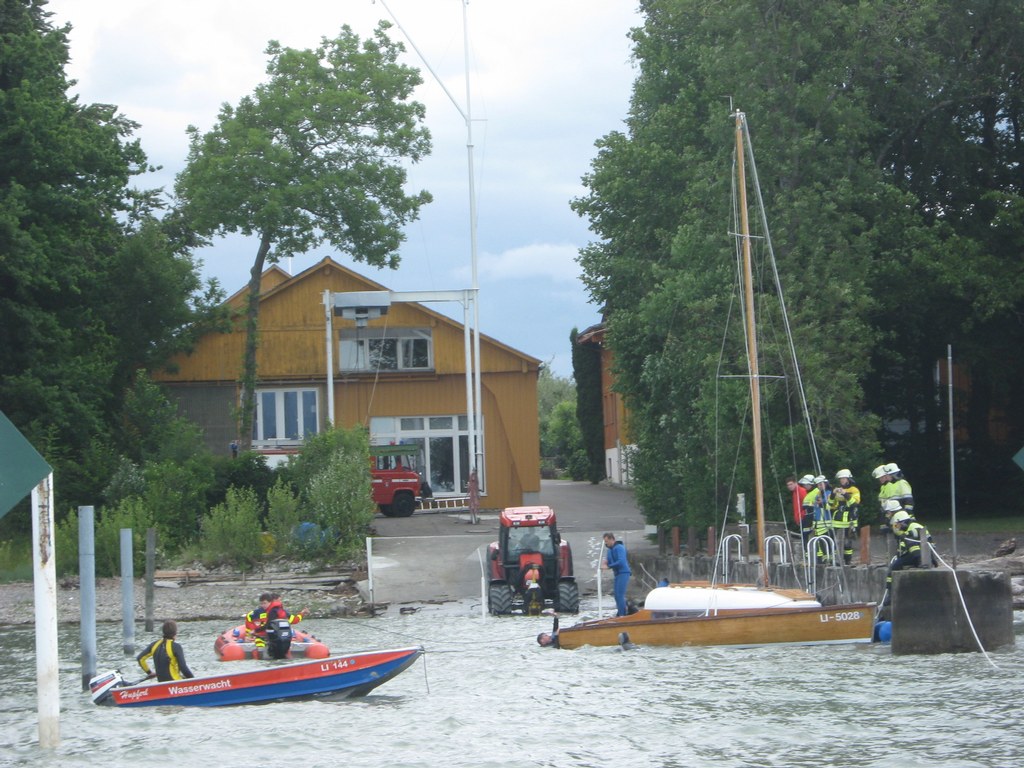 Während 4 Boote schnell mit Hilfe des Pächters der Wasserburger Segelschule aufgerichtet waren, dauerten die Arbeiten an den weiteren Booten etwas länger. Ein Boot mußte nach dem aufrichten mittels Tauchpumpe gelenzt werden und konnte dann direkt an den Eigner übergeben werden. Ein weiteres Boot das sich losgerissen hatte wurde durch die mittlerweile eingetroffenen Kräfte der Wasserwacht Nonnenhorn und Wasserwacht Wasserburg vom Ufer zurück ins Bojenfeld geschleppt und dort sicher vertäut. Bei einem Segelboot das in der Eschbachbucht auf der Seite lag und vollgelaufen war gestalteten sich die Arbeiten schwieriger. Die mittlerweile eingetroffenen Einsatzkräfte der Wasserwacht Weiler versuchten dieses mittels Hebesäcken (aufblasbare Luftsäcke) anzuheben, aufgrund des starken Windes und Wellengangs war ein auspumpen aber nicht sofort möglich. Mit nachlassendem Wellengang gelang es das Boot etwas weiter anzuheben und die Feuerwehr Wasserburg konnte dann mittels Pumpen das Boot leeren. Danach wurde es durch das Mehrzweckboot der Wasserburger Feuerwehr in die Yachtwerft Reutenen geschleppt, wo es an Land gebracht und dem Besitzer übergeben wurde.