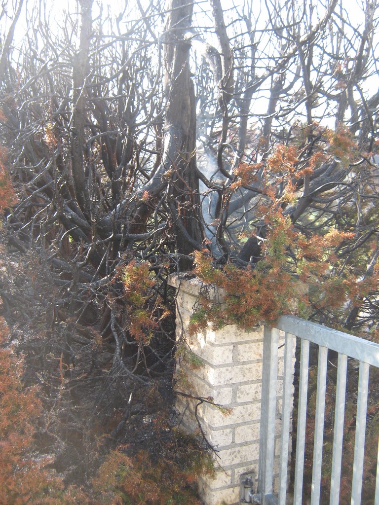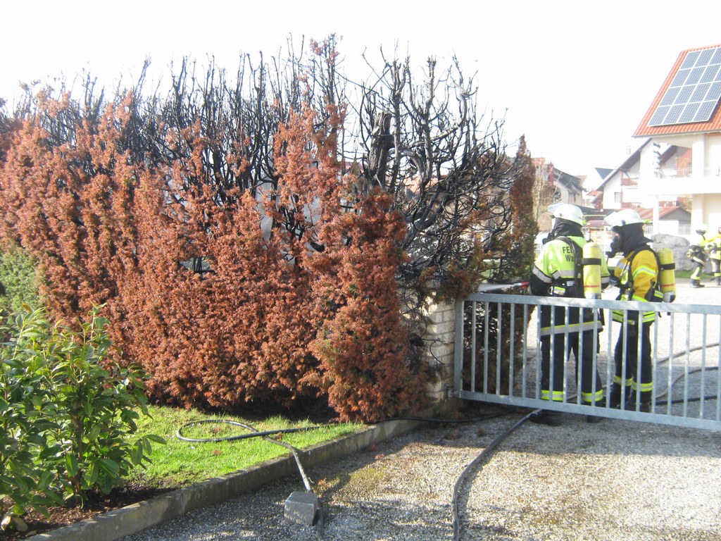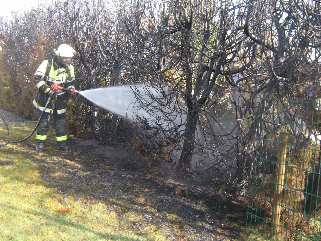 Beim Eintreffen des HLF stand die Hecke im Vollbrand und Nachbarn waren bereits mit einem Gartenschlauch als Ersthelfer mit Löscharbeiten zugange.