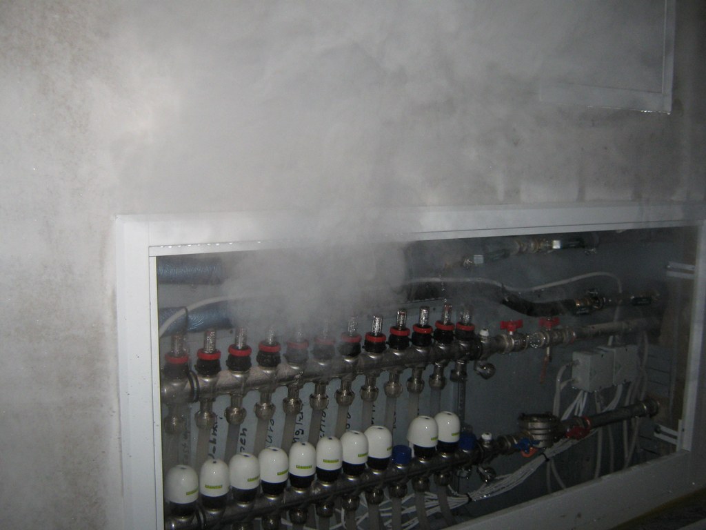 Wie es sich heraus stellte, war in dem Heizungssystem ein immenser Überdruck vorhanden. Dies zeigte sich, indem durch die Wasserhähne Wasserdampf entwich. In manchen Zimmern war die Wasserdampfschicht einer Rauchschicht gleichzusetzen. Nur am Boden kriechend war Sicht vorhanden. Zusätzlich gab es Wasseraustritt in den in der Decke eingelassenen Halogenstrahlern, sowie in den Sicherungskästen.