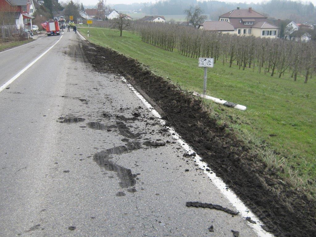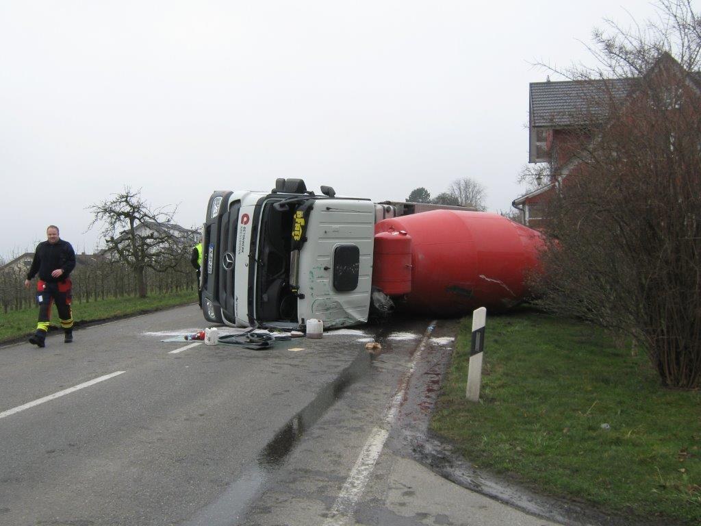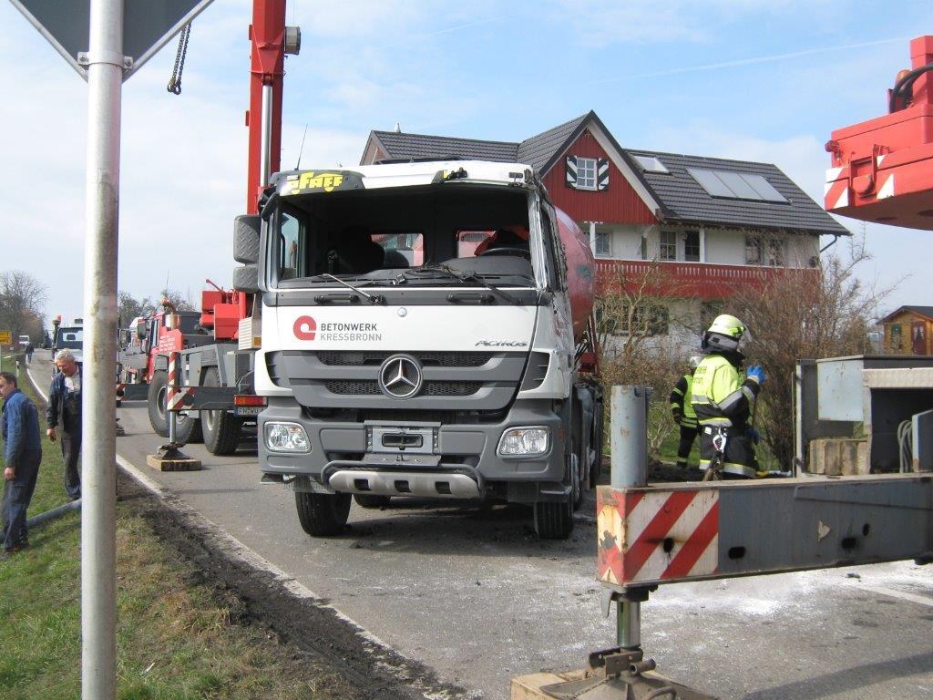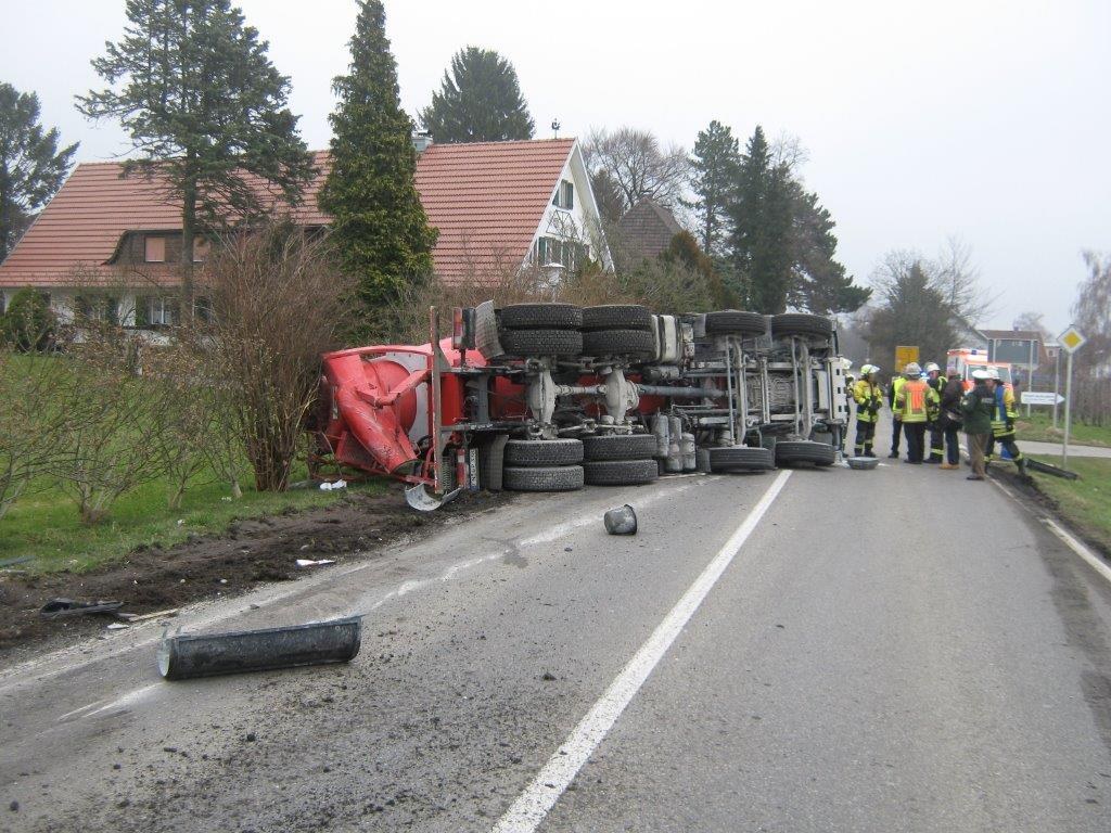 Zu einem Verkehrsunfall auf der Kreisstraße LI 16 in Höhe Wasserburg wurden die Feuerwehren aus Wasserburg und Lindau, der Rettungsdienst und die Polizei am Dienstag gegen 11.30 Uhr alarmiert. Ein Betonmischer war ins Schleudern geraten, hatte einen geparkten PKW gestreift, einen Gartenzaun niedergerissen und war dann auf die Seite gestürzt, knapp an einer Hauswand vorbei. Nach erster Lageerkundung durch den Einsatzleiter der Feuerwehr Wasserburg wurde festgestellt daß der Fahrer entgegen den ersten Meldungen nicht eingeklemmt war, er wurde umgehend vom Rettungsdienst übernommen und ins Krankenhaus Lindau transportiert.