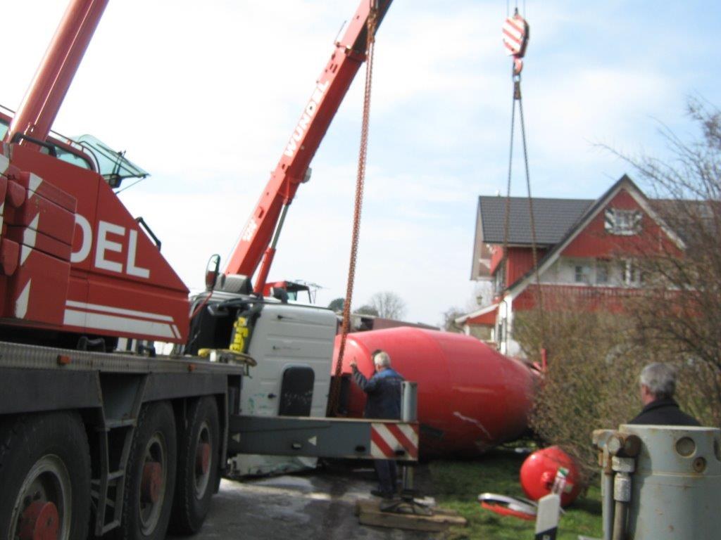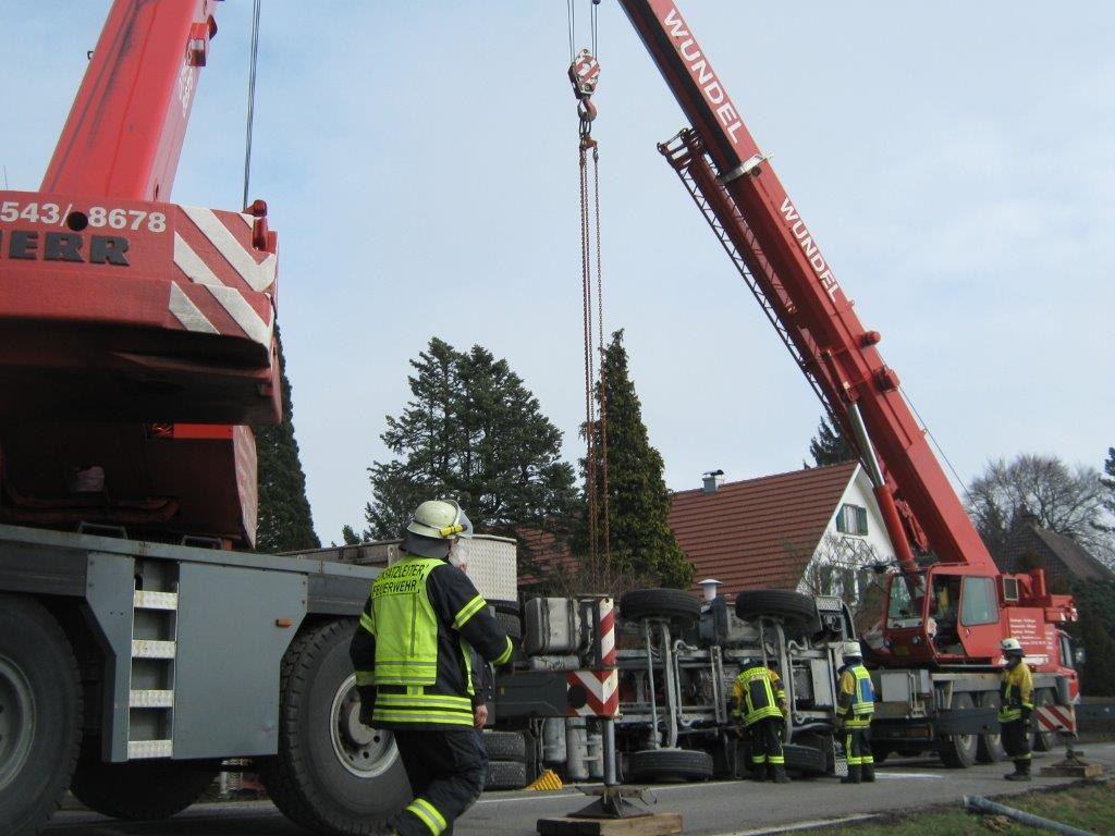 Die Feuerwehr Lindau konnte daraufhin den Einsatz komplett abbrechen. Durch die Feuerwehr Wasserburg wurden auslaufende Betriebsstoffe aufgenommen, Trümmerteile entfernt und das Fahrzeug für die Bergung vorbereitet. Da der Betonmischer gefüllt war, mussten zwei Autokrane eines Privatunternehmens angefordert werden um das rund 32 Tonnen schwere Fahrzeug wieder aufzurichten und für den Abschleppdienst vorzubereiten.