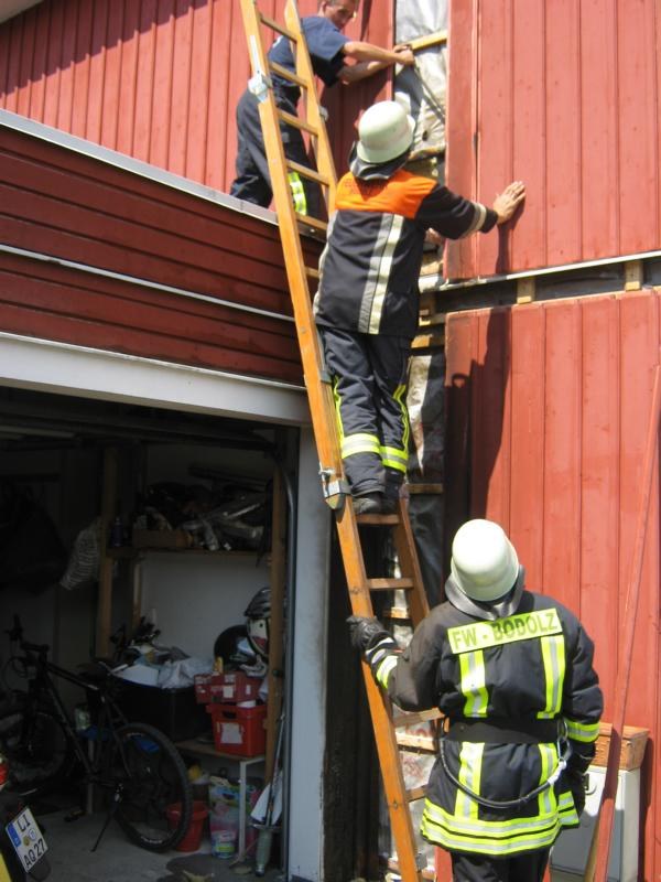 Dort war eine Mülltonne in Brand geraten und das Feuer drohte auf das in Holzbauweise gebaute Haus überzugreifen. Nur durch das schnelle Eingreifen von Anwohnern und der Feuerwehr Bodolz konnte ein größerer Schaden abgewendet werden. Die Holzverschalung hatte bereits Feuer gefangen und das Feuer war kurz davor sich in die Hauswände zu fressen. Die Feuerwehr Wasserburg wurde von den Bodolzer Kollegen mit der Wärmebildkamera nachalarmiert um das Gebäude auf möglicherweise noch vorhandene Glutnester zu untersuchen, durch die Bodolzer Feuerwehr wurden Teile der Wandverschalung entfernt um eine weitere Gefahr auszuschließen. Nach einer halben Stunde konnte Entwarnung gegeben werden und die ehrenamtlichen Helfer konnten an Ihre Arbeitsstellen zurückkehren.