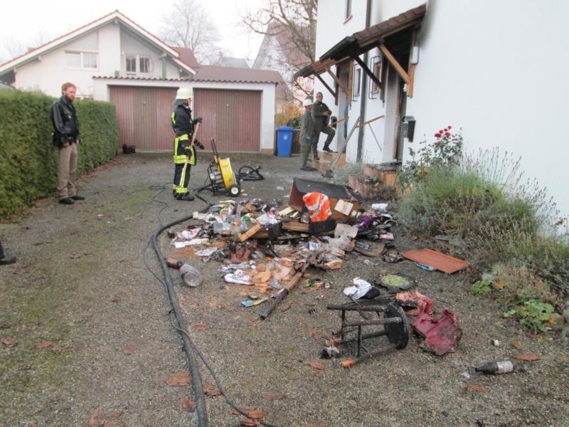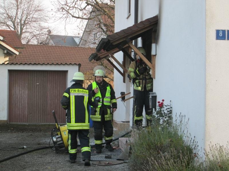 In einer Dopplhaushälfte war es zu einem Brand gekommen der durch Bewohner bis zum eintreffen der Feuerwehr bereits mit Pulverlöschern bekämpft wurde. Die Feuerwehr Bodolz, unterstützt von der Feuerwehr Lindau (Wache West) leitete unverzüglich die Brandbekämpfung ein, von der Feuerwehr Wasserburg kamen 2 weitere Trupps unter Atemschutz zum Einsatz. Gemeinsam wurde der teilweise noch glimmende Brandschutt aus dem Haus geräumt und abgelöscht, die Stadtwerke wurden beim stromlos schalten des Gebäudes unterstützt. Mittels mehreren Wärmebildkameras wurde das komplette Haus auf mögliche versteckte Glutnester kontrolliert, die Feuerwehr Bodolz lüftete das Gebäude mittels Hochleistungslüfter durch.