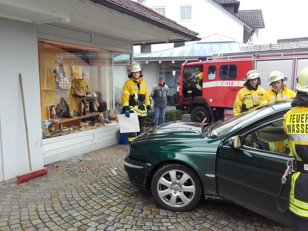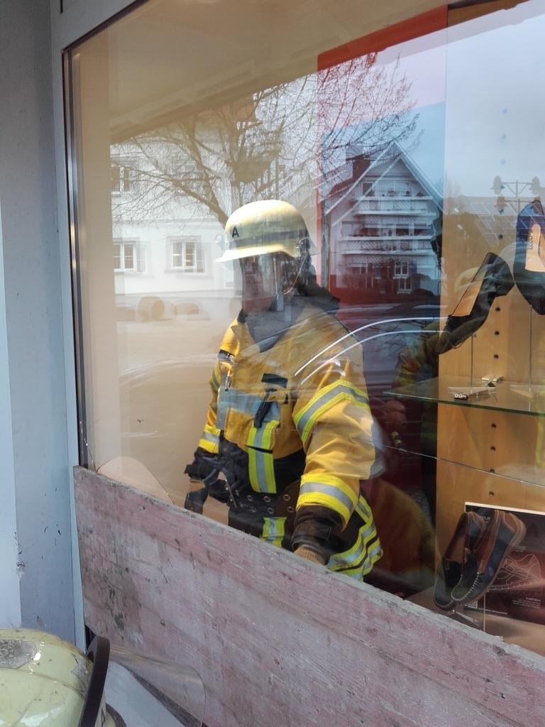 Am 19.02.2016 gegen 11.15 Uhr wurde die Feuerwehr Wasserburg zu einem Verkehrsunfall in die Halbinselstraße gerufen. Ein PKW-Lenker hatte vermutlich Vor- und Rückwärtsgang verwechsel und war in ein Schaufenster gefahren, glücklicherweise war zu dem Zeitpunkt niemand auf dem ansonsten viel genutzten Gehweg unterwegs so das keine Verletzten zu beklagen waren.