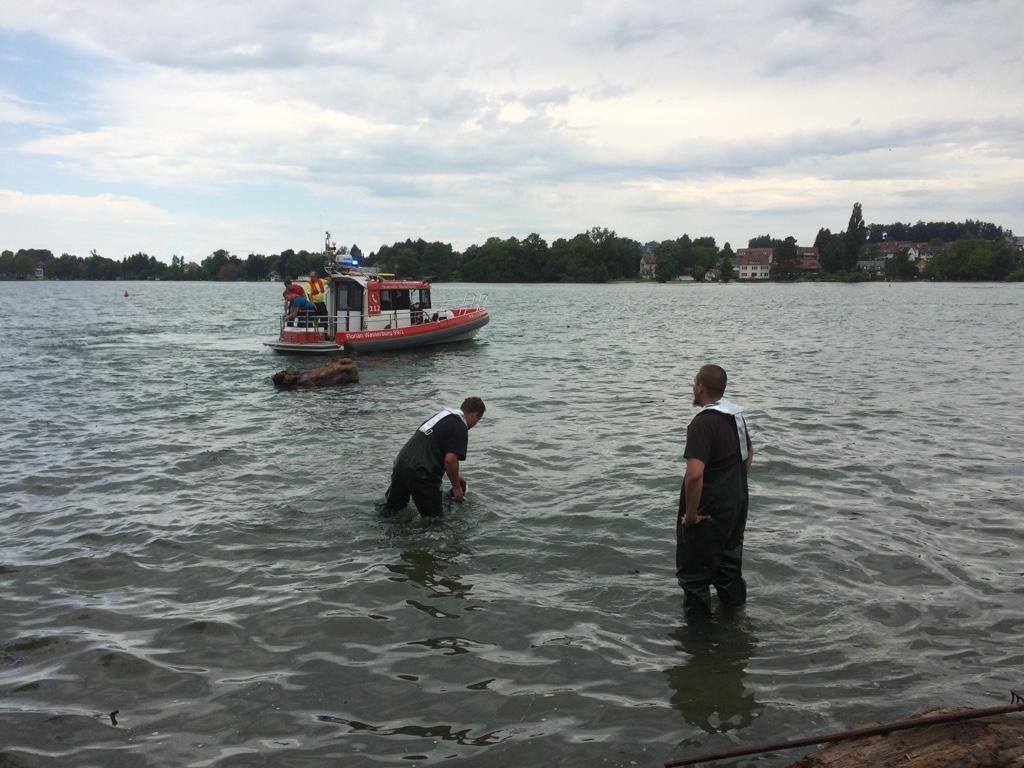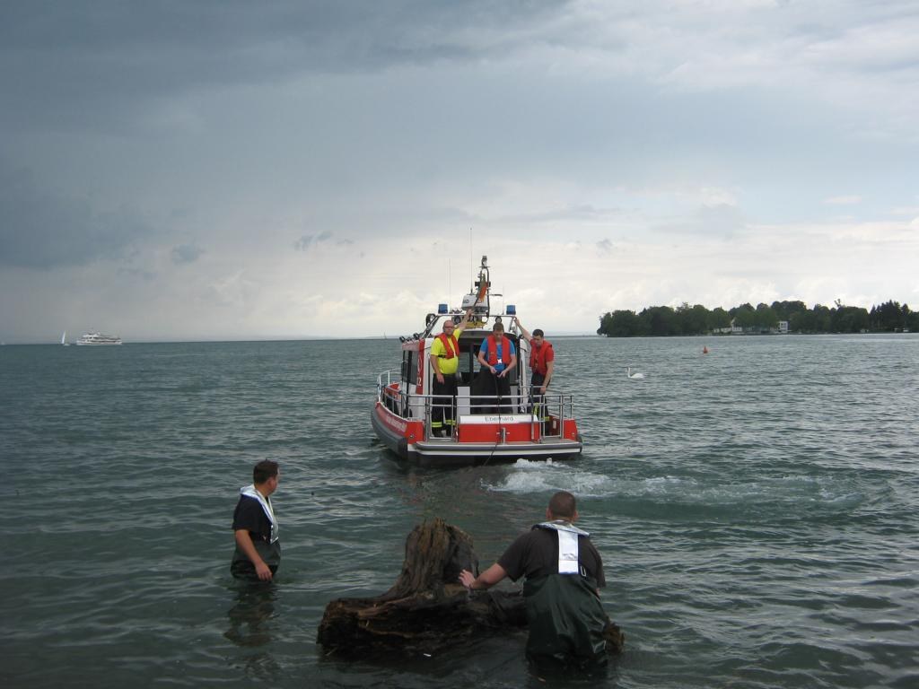 Am Samstag 25.06.2016 am Nachmittag zog erneut Unwetter, diesmal aus Richtung Westen auf. 2 große Wurzelstöcke und mehrere Baumstämme die im Wasser trieben drohten bei dierer Windrichtung eine Ufermauer zu beschädigen die eine Restaurantterasse vom See abgrenzt. Bei starkem Wellengang und Sturm drohten hier größere Sachschäden, deshalb wurden die Wurzelstöcke mittels Mehrzweckboot gesichert und an einen Ort abgeschleppt an dem sie vom Wasserwirtschaftsam mittels Bagger aufgenommen und entsorgt werden können.