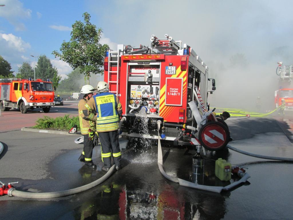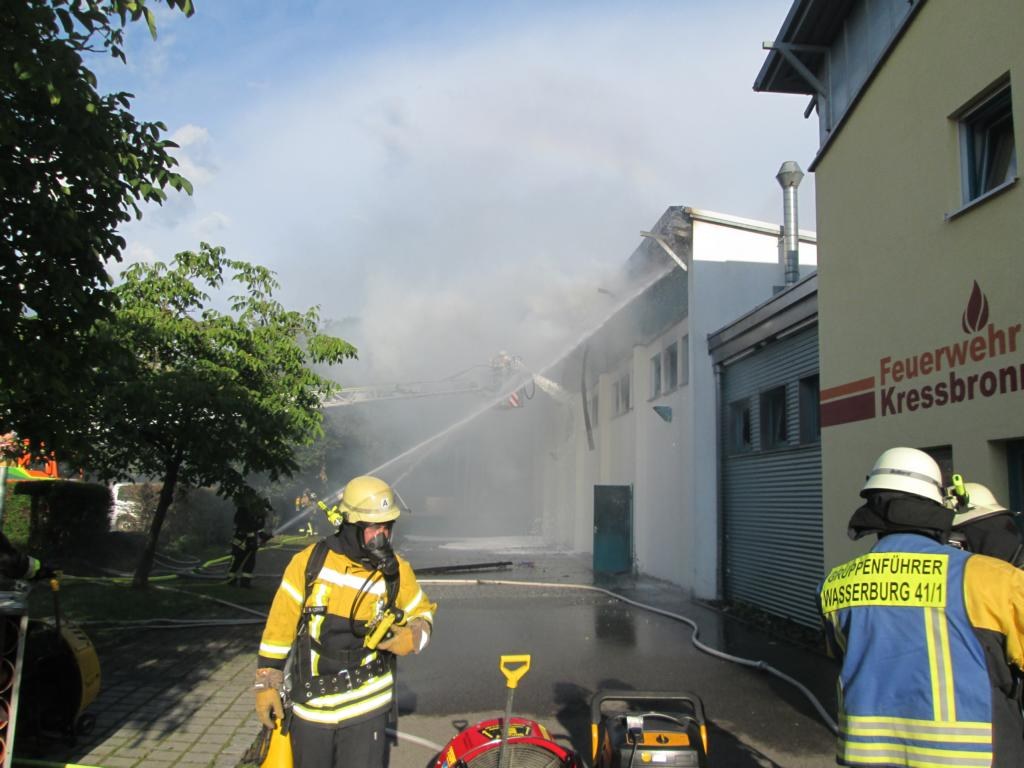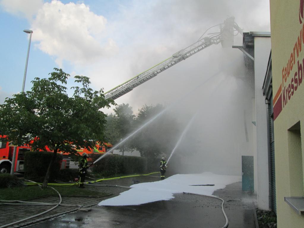 Am Sonntag, 24.07.2016 gegen 18 Uhr wurde die Feuerwehr Wasserburg zum Vollbrand des Gerätehauses der Feuerwehr Kressbronn nachalarmiert. Die Feuerwehr Wasserburg war mit 3 Fahrzeugen und 25 Mann im Einsatz, unsere Aufgaben waren den vom Feuer nicht direkt betroffenen Funktionstrakt möglichst von Löschwasser frei zu halten, hier war die Besatzung des LF 20 KatS mit 6 Mann unter Atemschutz mit Wassersauger im Einsatz. Die Besatzung des HLF unterstützte mit Atemschutzgeräteträgern die Brandbekämpfung, außerdem wurden der Schaumaufbau der Feuerwehr Lindau durch Personal unterstützt.