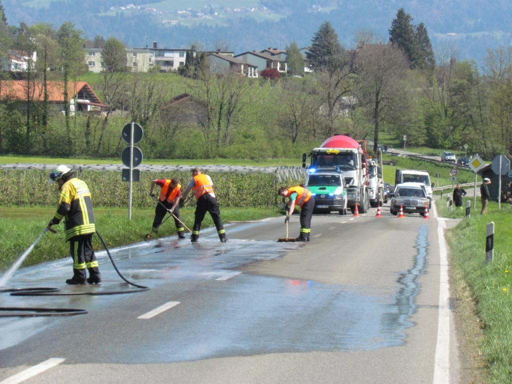 Auf mehreren hundert Metern war die Fahrbahn massiv mit Gülle verschmutzt, dies stellt insbesondere für Zweiradfahrer eine erhebliche Gefahr dar. Mittels Strahlrohr und per Handarbeit mit Besen wurde die Verschmutzung in mühevoller Handarbeit entfernt, ein zweites Löschfahrzeug war unterwegs um Wasser nachzuliefern.