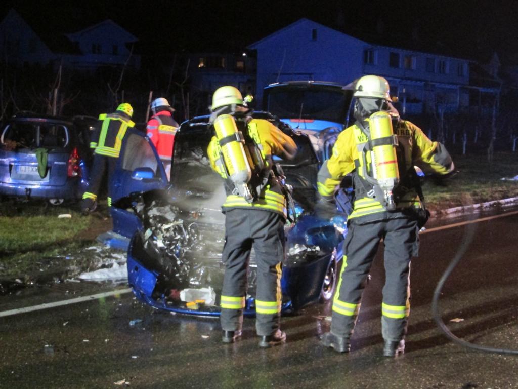 2 PKW waren ineinander geprallt, einer der beiden hatte Feuer gefangen, die insgesamt 4 Verletzten Insassen konnten jedoch zum Glück selbstständig die Fahrzeuge verlassen.