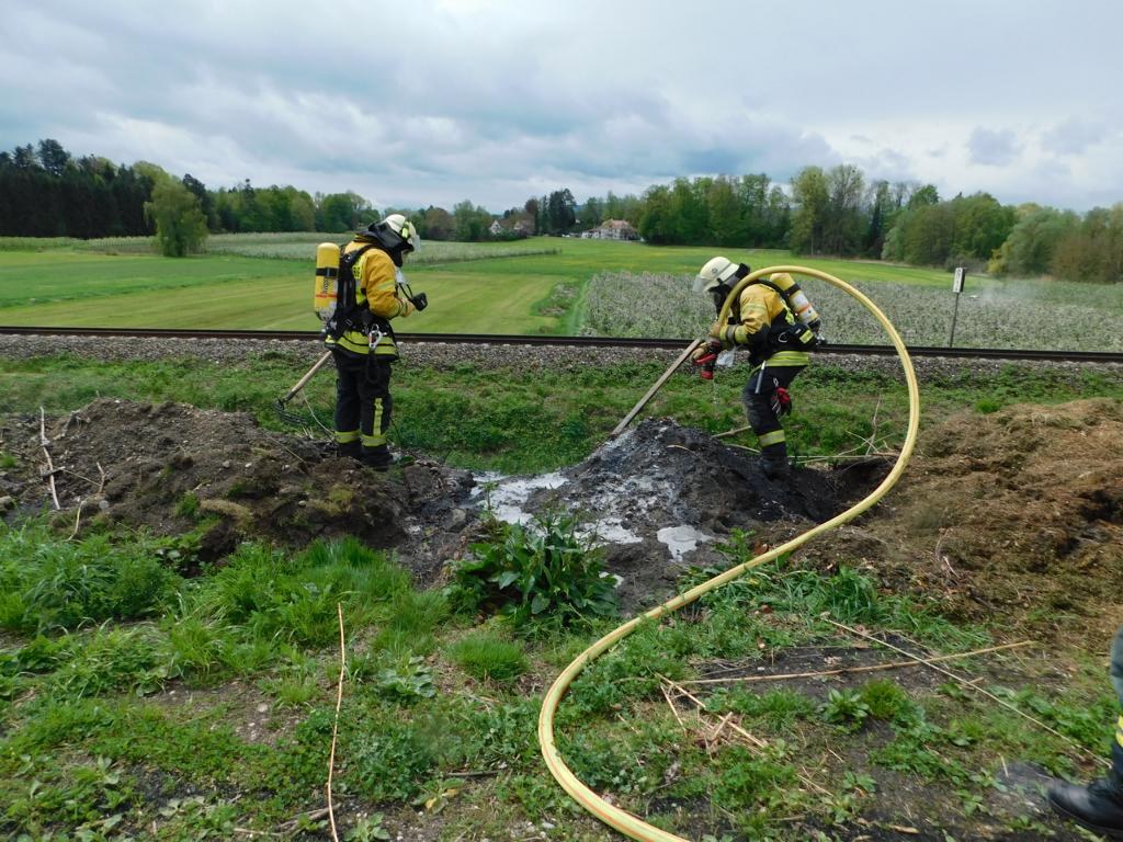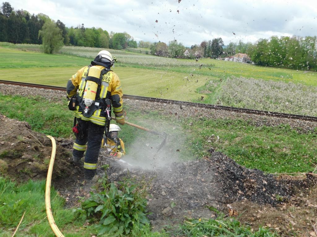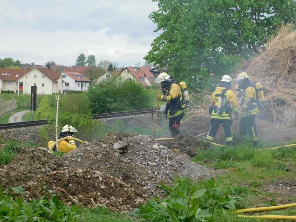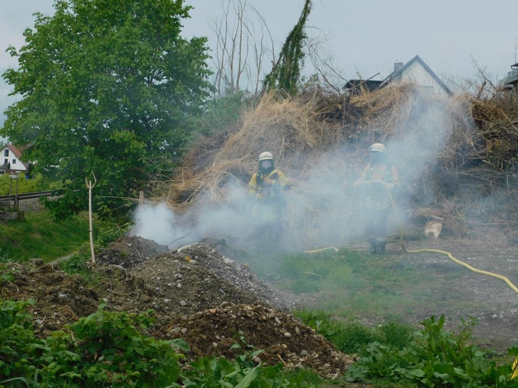 Auf der sogenannten "Schutte" im Bereich der Friedrichshafener Straße / Ortsausgang Richtung Enzisweiler waren durch abgelagerte Asche trockene Grünabfälle in Brand geraten. Glücklicherweise konnte der durch Wind angefachte Brand noch rechtzeitig gelöscht werden bevor er den mehrere Meter hohen, dahinter gelagerten Haufen mit getrocknetem Grünschnitt erreichen konnte. Feuerwehrleute mit Atemschutzgeräten verteilten mittels Gabeln und Hacken den Haufen um alle Glutnester zu erreichen und löschten alles mit einem C-Rohr ab. Nachdem alle Glutnester gelöscht und mit der Wärmebildkamera nachkontrolliert waren, konnte der Einsatz nach einer knappen Stunde beendet werden.