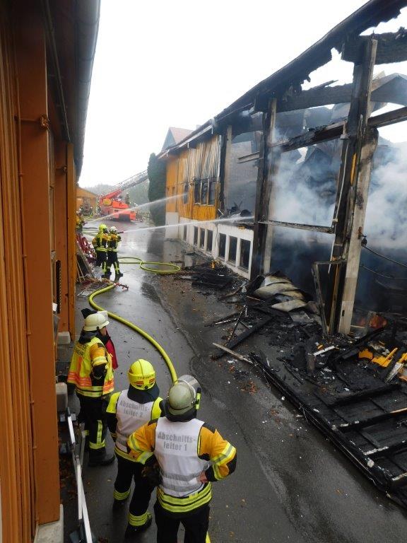 Nachdem die Wasserversorgung aufgebaut war konnte ein massiver Löschangriff von allen Seiten gestartet werden und mit zahlreichen Rohren wurden die Nachbargebäude abgeschirmt. Schwierig gestaltete sich dies vor allem am östlich direkt an die Halle angebauten Wohnhaus. Hier kam es zur Brandausbreitung im Dachstuhl die im Innenangriff und mit massivem Wassereinsatz von außen gestoppt wurde. Leider entstand jedoch ein erheblicher Wasserschaden an diesem Haus. Das nördlich gelegene Wohnhaus überstand den Einsatz unbeschadet. An der westlich gelegenen Halle begannen einige Teile der Dachverschalung zu brennen, dies konnte jedoch sofort abgelöscht werden. Außer geschmolzenen Kunststoffteilen und geplatzten Fensterscheiben überstand die Halle mit zahlreichen darin gelagerten Booten den Einsatz unbeschadet. Auch drei südlich dieser Halle im Freien gelagerte Boote überstanden den Einsatz weitestgehend unbeschadet. Ein Boot war noch vor Eintreffen der Feuerwehr von Mitarbeitern mittels Trailer aus der in Brand geratenen Halle ins Wasser gerollt und somit gerettet worden.
