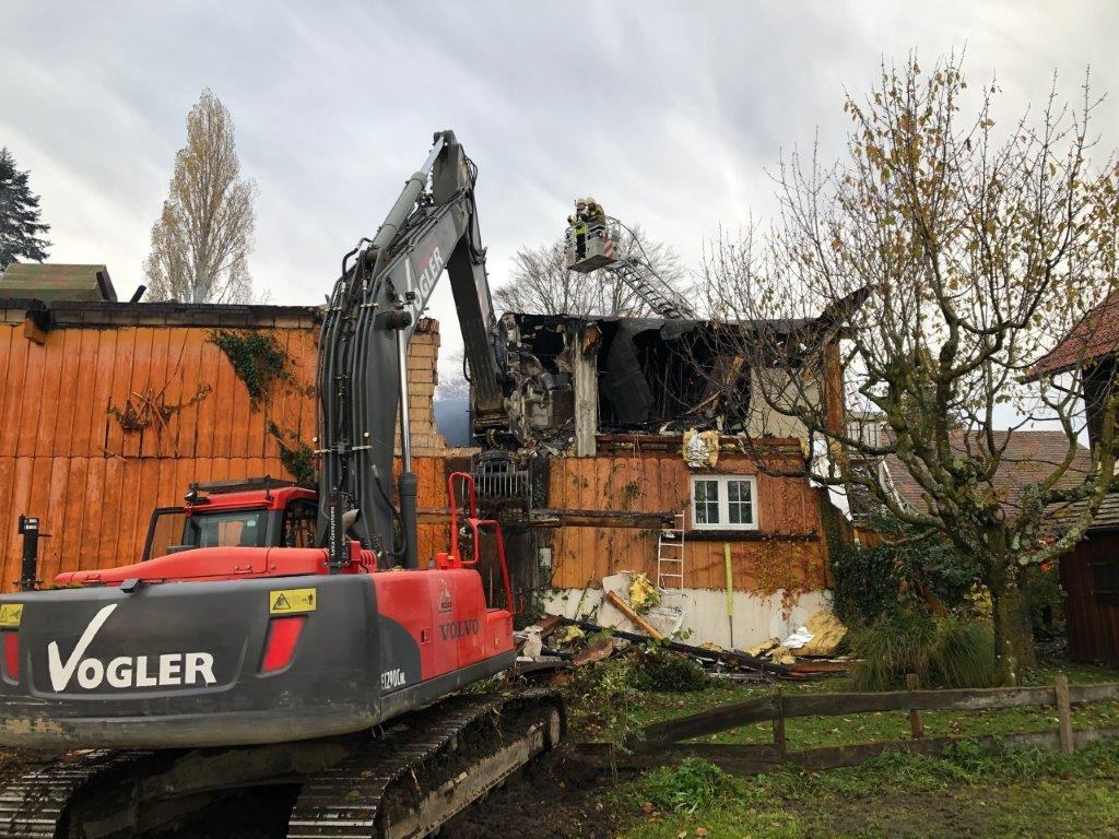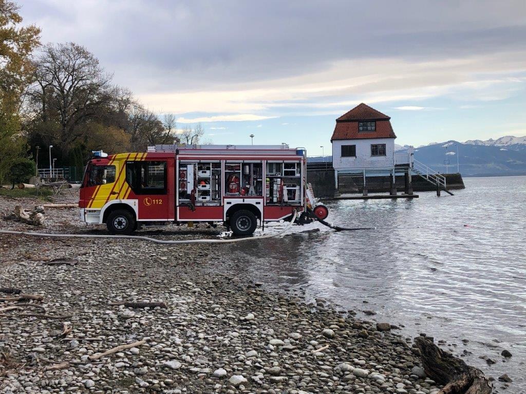 Im Laufe des Nachmittags konnten nach und nach benachbarte Feuerwehren aus dem Einsatz entlassen werden. Ab 19 Uhr war eine Brandwache mit dem LF20 KatS der Feuerwehr Wasserburg vor Ort und war die ganze Nacht hindurch immer wieder mit Nachlöscharbeiten beschäftigt. Diese Brandwache wurde am Freitag 15.11. vormittags mit dem MTW fortgeführt, mittags gegen 13 Uhr wurden durch den auffrischenden Wind wieder einige Glutnester angefacht und weitere umfangreichere Nachlöscharbeiten notwendig. Hierzu wurden die Löschfahrzeuge der Feuerwehr Wasserburg ebenso alarmiert wie die Drehleiter der Feuerwehr Lindau (Wache West). Mittels Mittelschaum wurden verbliebene Glutnester abgedeckt und nach weiteren Aufräumarbeiten konnten die Einsatzkräfte gegen 16 Uhr wieder einrücken. Das THW Lindau war am Freitag noch bis 17 Uhr mit dem Einholen der Ölsperren beschäftigt.
