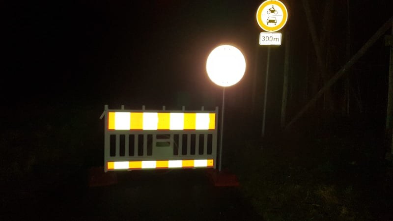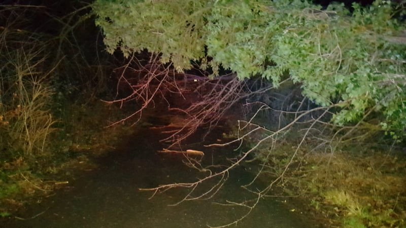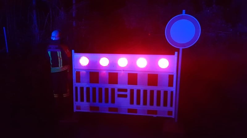 Da der genaue Einsatzort unklar war, begaben sie sich auf Erkundung und stellten mehrere umgestürzte Bäume im Bereich der Abzweigung nach Bettnau und im weiteren Bereich der Straße nach Bettnau fest. Da während der starken Windböen und der herrschenden Dunkelheit das sägen an den zum Teil unter Spannung stehenden Bäumen zu gefährlich war wurde die Straße durch die zwischenzeitlich alarmierte Feuerwehr Hege mit bei uns abgeholtem Absperrmaterial abgesichert und für die Nacht die Durchfahrt gesperrt. Die Bäume werden im Nachgang bei Tageslicht entfernt werden.