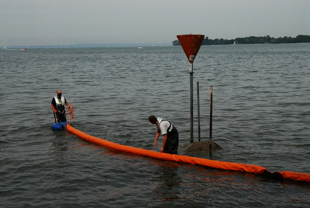 Über Nacht hatte sich der Zufluss der unbekannten Substanz ausgeweitet und der Einsatzleiter der Feuerwehr Nonnenhorn hatte zusammen mit dem Wasserwirtschaftsamt entschieden das nun auch zur Sicherheit eine Ölsperre in den Bodensee eingebracht werden sollte.