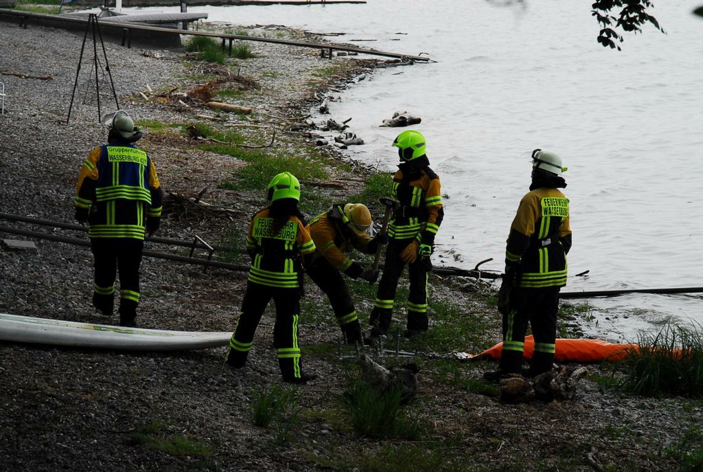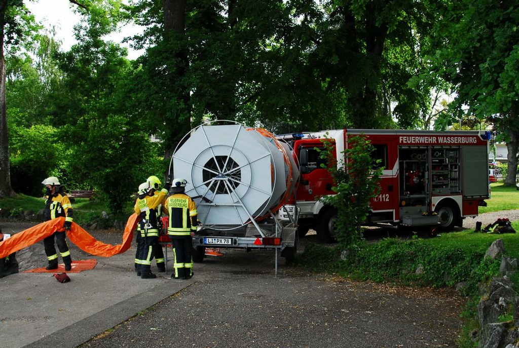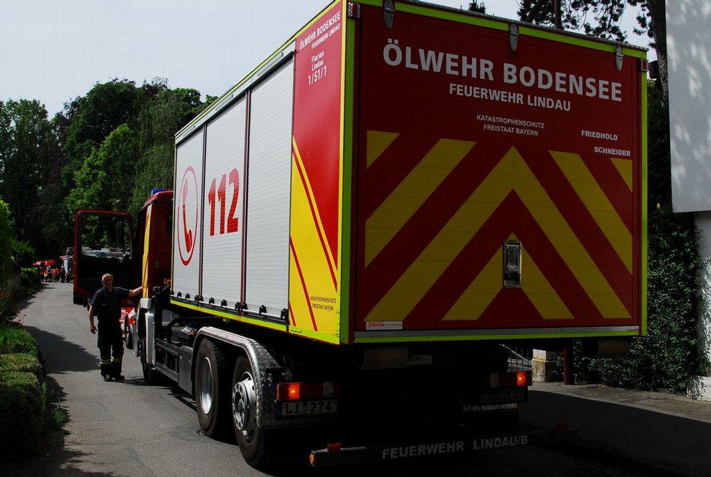 Durch die Kräfte der Feuerwehr Wasserburg wurden ca. 150m Ölsperre auch zum Uferschutz in den Bodensee eingebracht und sicher vertäut, von der Feuerwehr Lindau wurde zusätzliches Material zur Sicherung der Ölsperre im Wasser angefordert, dies wurde mit dem Wechselladerfahrzeug und dem Abrollbehälter Ölwehr an die Einsatzstelle gebracht.