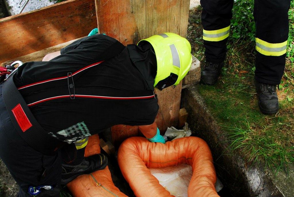 Die Ölsperre die in der Nacht zuvor direkt in den Bach eingebaut wurde wurde kontrolliert und zusätzliches Ölbindevlies eingebracht. Eine Wasserprobe wurde ebenfalls von uns genommen und dem Wasserwirtschaftsamt übergeben.