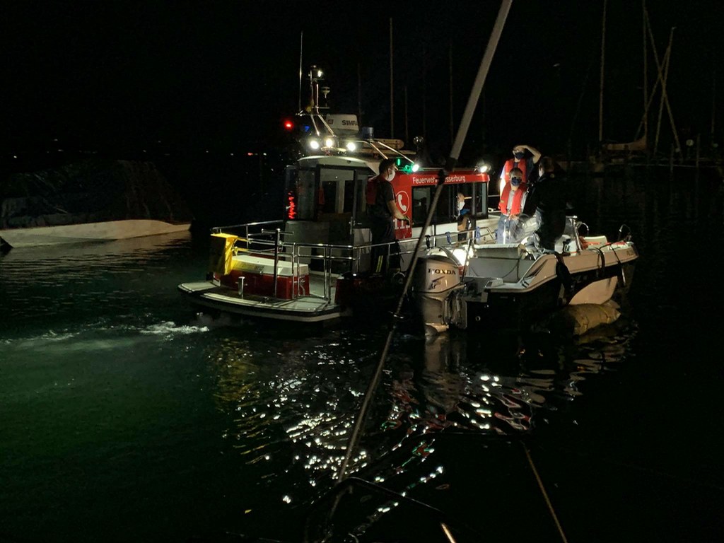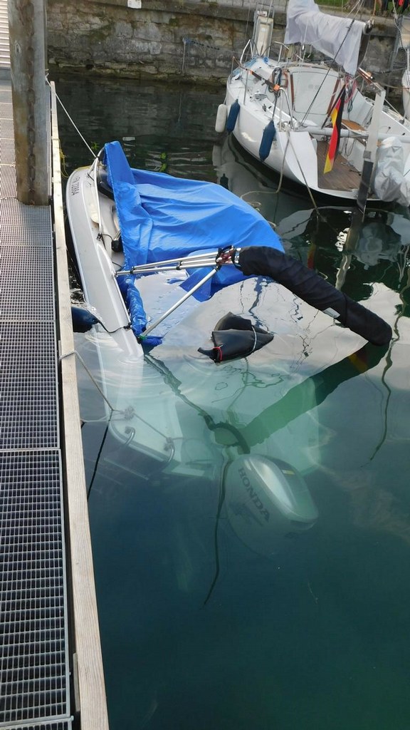 Das havarierte Boot lag am Gästesteg im Hafen Wasserburg. Beim Eintreffen der Feuerwehr Wasserburg war das Motorboot voll Wasser gelaufen und größtenteils unter Wasser. Das Heck lag auf Grund.