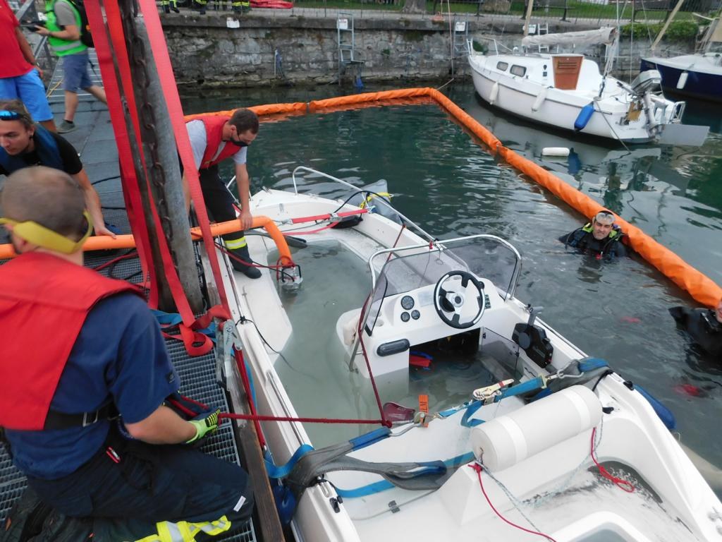 Die Bergung wurde vom THW übernommen. Die THW Taucher haben Hebesäcke an dem Boot befestigt. Nach erfolgreichem Heben des Bootes wurde dies an der Wasseroberfläche stabilisiert und das eingetretene Wasser durch die Feuerwehr abgepumpt.