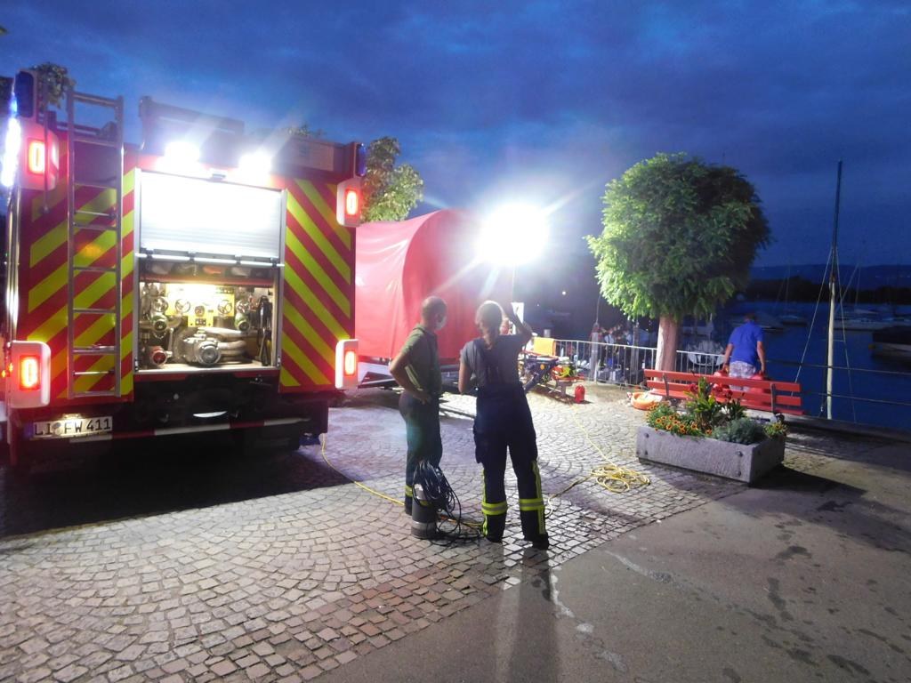 Feuerwehr Wasserburg (20 Mann/Frau) mit drei Fahrzeugen und ein Mehrzweckboot