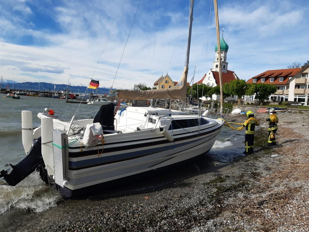 Zu einer Bootsbergung wurde die Feuerwehr Wasserburg am 10.05.2021 gegen 8.30 Uhr alarmiert. Ein Segelboot hatte sich im Fönsturm über Nacht losgerissen und wurde ans Ufer getrieben. Die Wasserschutzpolizei hatte es bei unserem eintreffen bereits gesichert, es drohte jedoch das Heck durch Wellenschlag und größere Steine weiter beschädigt zu werden.