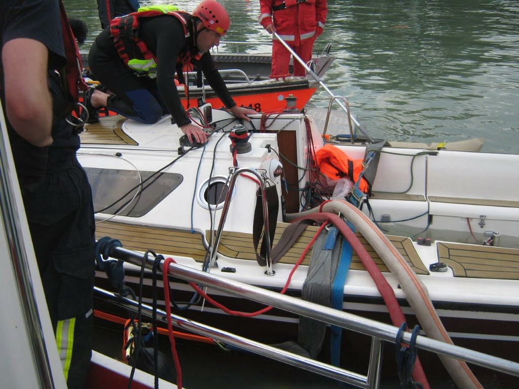 Dieses wurde mit Hilfe der Wasserwacht und dem THW  gedreht und mittels Hebesäcken wieder an die Oberfläche gebracht. Anschließend wurde das Boot ausgepumpt und konnte dann mit einem Sicherungsboot zum Auswassern in eine nahe gelegene Werft geschleppt werden. Dort wurde das Boot dem Eigner übergeben und die Feuerwehr konnte nach knapp 7 Stunden wieder einrücken.