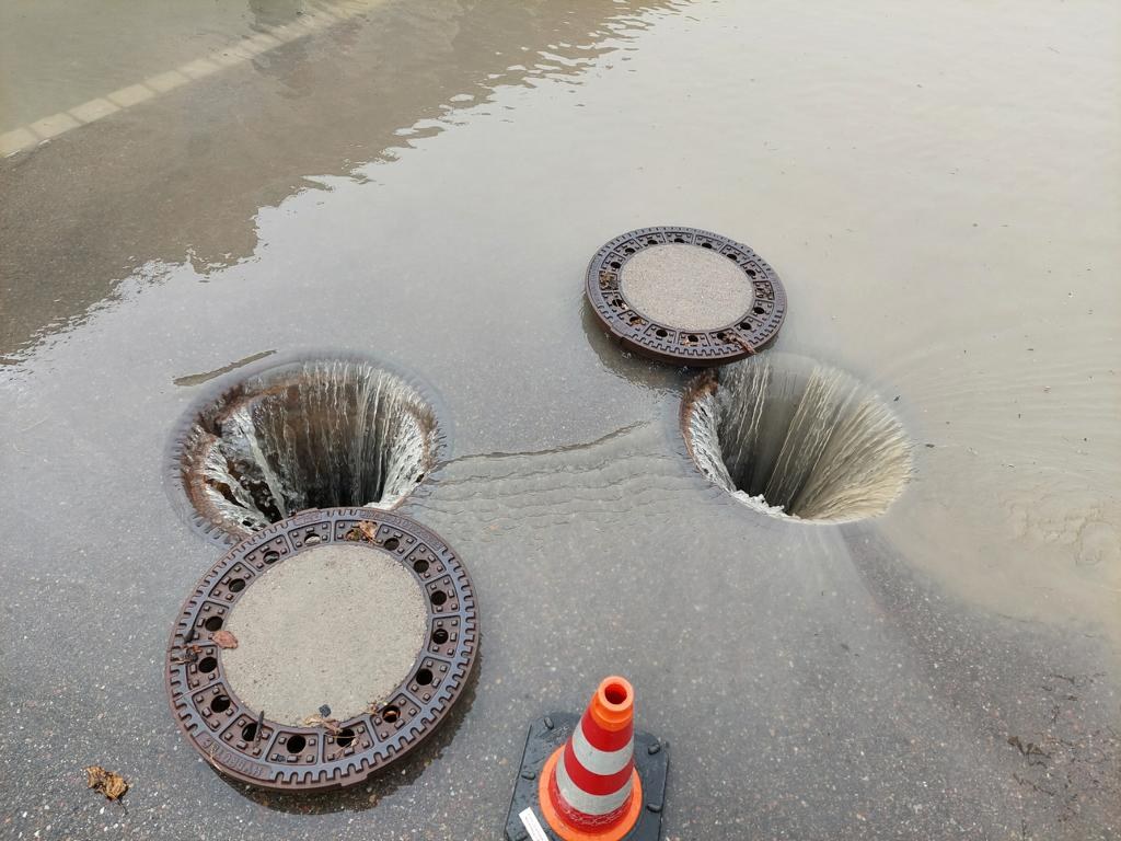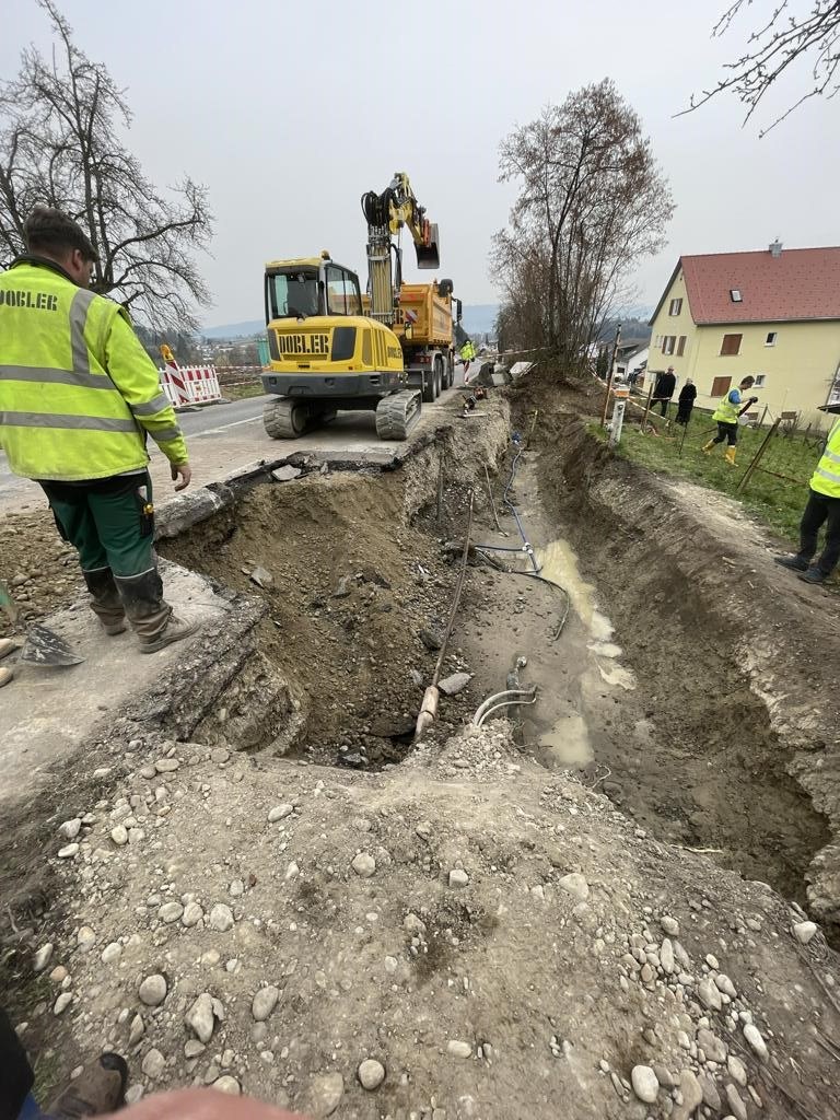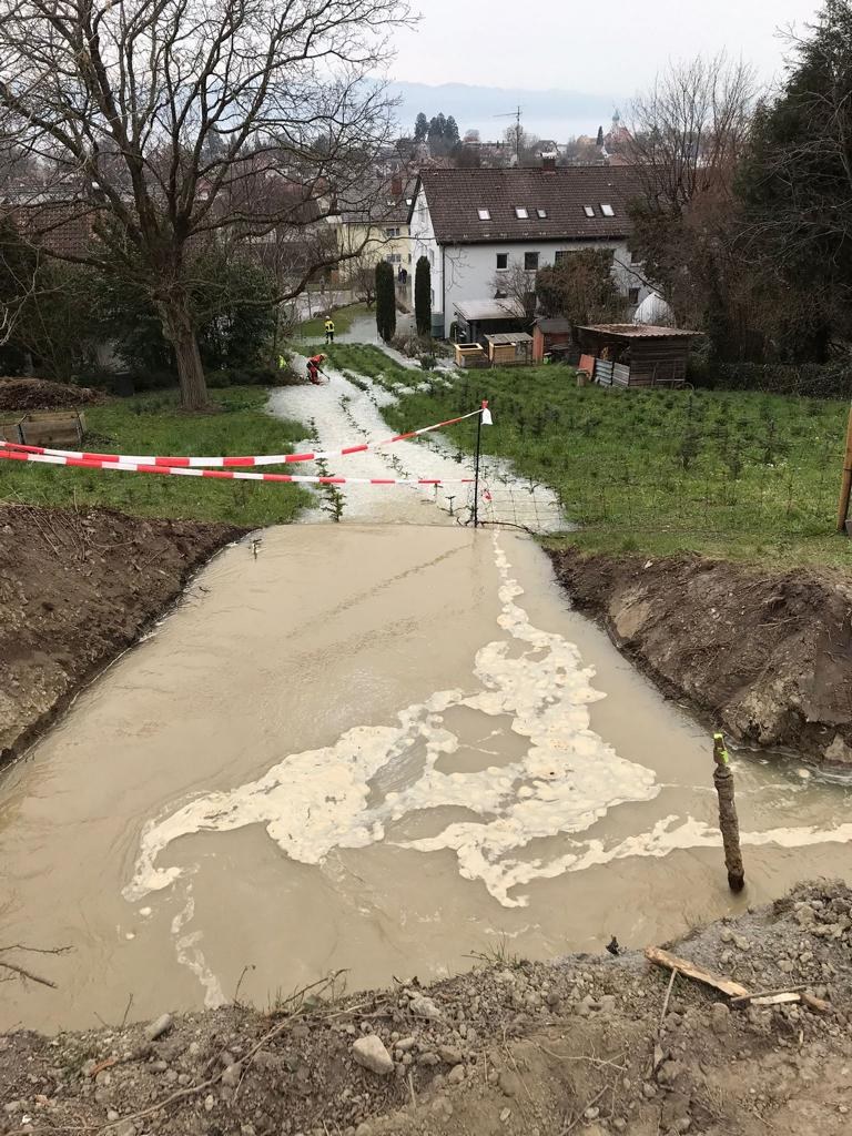 Gingen wir zuerst von einem Bagatelleinsatz aus so stellte sich die Lage vor Ort weit dramatischer dar. Bei Bauarbeiten an der Kreisstraße LI 16 wurde eine Hauptwasserleitung, die vom Seepumpwerk Nonnenhorn nach Lindau führt, beschädigt und ein großer Sturzbach ergoß sich den Hügel abwärts Richtung Sonnhaldenstraße und Gartenweg.
