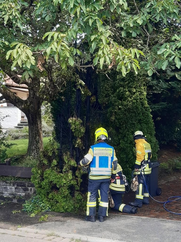 Am 05.08.2022 um 12.15 Uhr wurden wir von der Leitstelle Allgäu in den Ortsteil Reutenen gerufen. Vor Ort stellte sich heraus das bei Abflammarbeiten zur Unkrautvernichtung eine Thujahecke in Brand geraten war. Nur mit großem Glück entgingen die Hauseigentümer einem größeren Feuer, zum einen war zur nächsten Thuja ein Abstand von knapp 2 Metern, zum anderen eilten sofort einige Nachbarn mit Gartenschläuchen und Gießkannen zur Hilfe.