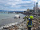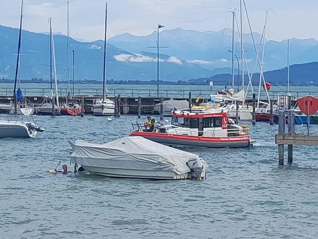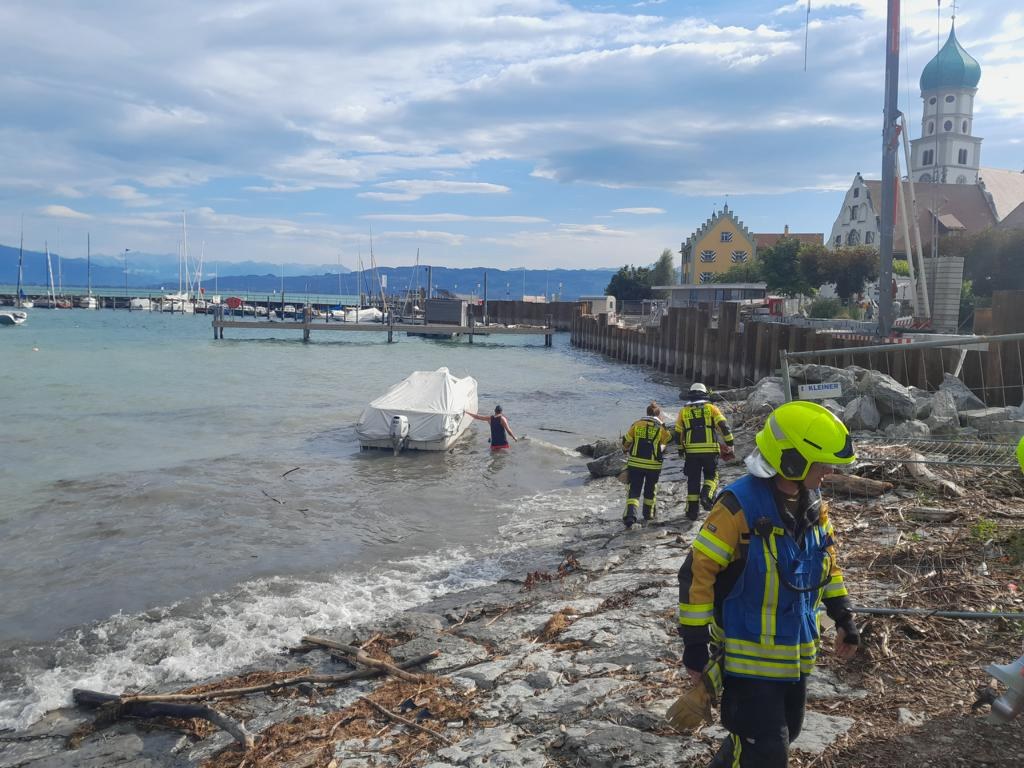 An einem Motorboot war am Liegeplatz die Kette durchgescheuert und es wurde von aufkommendem Wind und Wellen an das Ufer gedrückt. Passanten drückten es zurück ins Wasser um Schäden zu vermeiden und riefen die Feuerwehr. Von der Feuerwehr Wasserburg wurde das Boot mittels Mehrzweckboot gesichert und an eine Boje geschleppt und vertäut. Danach wurde der Hafenmeister von uns zum Havaristen gebracht und zusammen mit diesem das Boot auf Wassereinbruch und Schäden untersucht. Vom Hafemeister wurde entschieden das Boot in der Werft in Reutenen auszuwassern, wir begleiteten auf der Fahrt dort hin, nach einer guten Stunde konnten die Kräfte der Feuerwehr Wasserburg dann einrücken.