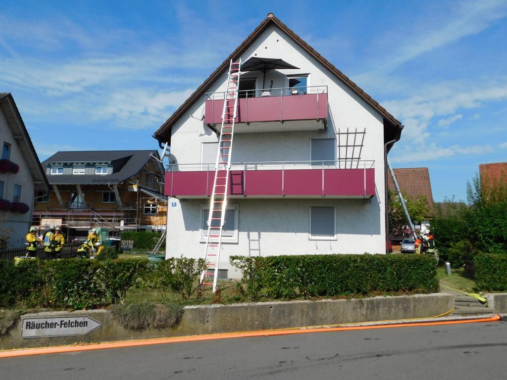 Vor Ort war deutlicher Brandgeruch wahrnehmbar, nach der Ersterkundung verschafften sich ein Atemschutztrupp der Feuerwehr Wasserburg über die Steckleiter einen Zugang durch ein Dachfenster. In der Wohnung wurde eine schmorende Flasche auf dem Herd festgestellt, außerdem befand sich ein Hund in der Wohnung. Der Herd wurde stromlos geschaltet, die Wohnung von der Feuerwehr Hege mit einem Hochleistungslüfter belüftet und der Hund konnte beruhigt werden und durfte nach den Lüftungsmaßnahmen in der Wohnung verbleiben.
