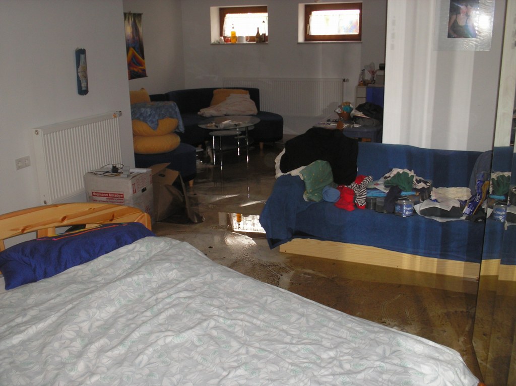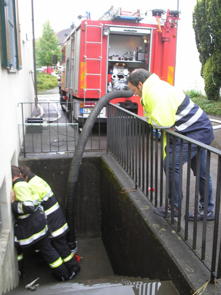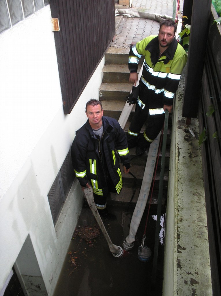 Als letzte Einsatzstelle an diesem Tag wurde dem HLF ein Mehrfamilienhaus in Bettnau zugewiesen das von uns umgehend angefahren wurde. Bei der Erkundung durch den Gruppenführer stellte sich heraus das eine Kellerwohnung in unbekanntem Ausmaß betroffen war, des Weiteren Öltanks im Keller gelagert waren. Da die Bewohner im Urlaub weilten wurde nach Rücksprache mit Verwandten die Kellertüre sowie 2 Türen im Keller gewaltsam geöffnet. Das Wasser stand bis zu 80cm hoch, die Öltanks waren aber glücklicherweise nicht betroffen. Mittels TP 4/1 und Wassersauger wurde der Keller so gut es ging trocken gelegt und an die Schwiegermutter der Betroffenen übergeben. Während diesem Einsatz wurde die Besatzung des HLF mehrmals von einem Nachbarn wegen verschiedenster Nichtigkeiten (Aufstellfläche des Fahrzeuges, Ableitung des ausgepumpten Wassers) verbal angegriffen, es ist erstaunlich wie manche Bürger mit "ihrer Feuerwehr" umgehen.