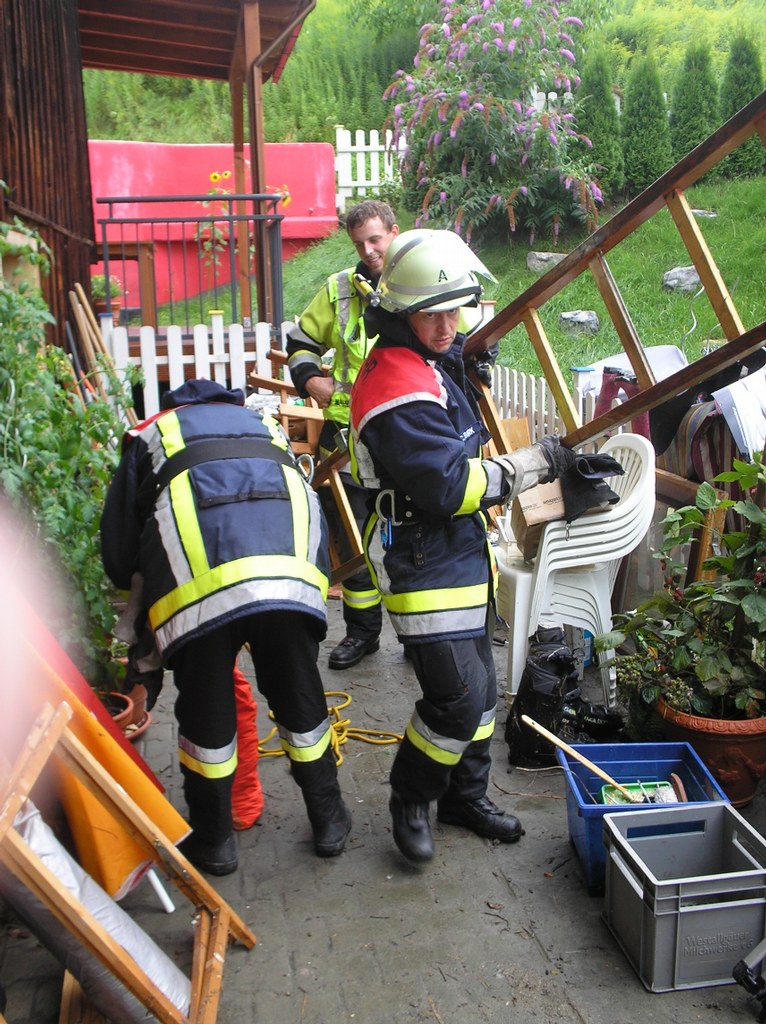 In einem weiteren Haus an der Bahnunterführung in Bodolz hatte der direkt darunter in einem Betonbett verlaufende Bach den Kellerboden angehoben. Durch eine Destabilisierung des Bodens drohte eine Palette Dachziegel abzurutschen und das Bachbett zu verstopfen was eventuell zu einer Unterspülung der Kellermauern geführt hätte. Vom Gruppenführer des HLF wurde die Feuerwehr Hege zur Unterstützung angefordert die das Bachbett mittels Steckleitern überbrückte, ein Kamerad der FF Wasserburg wurde mittels Höhensicherungssatz gesichert und trug zusammen mit den Kameraden der Feuerwehr Hege die Palette ab, eine weitere Gefahr war hierdurch gebannt.