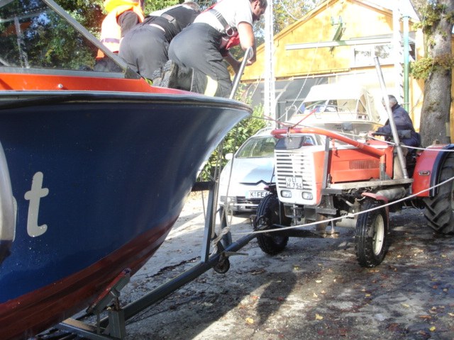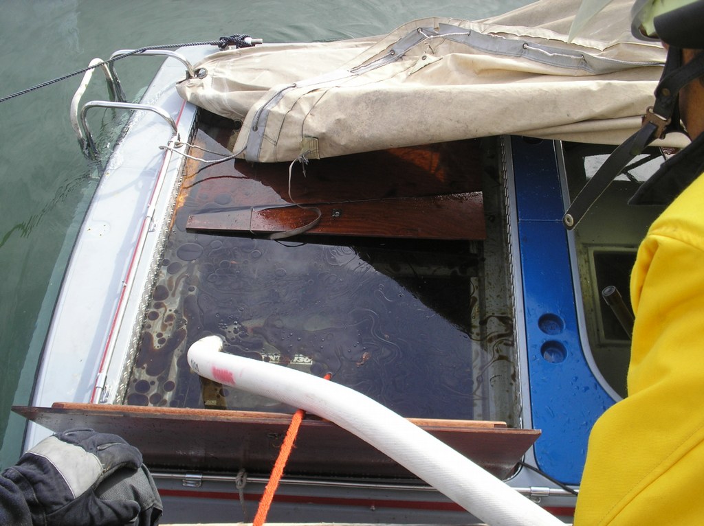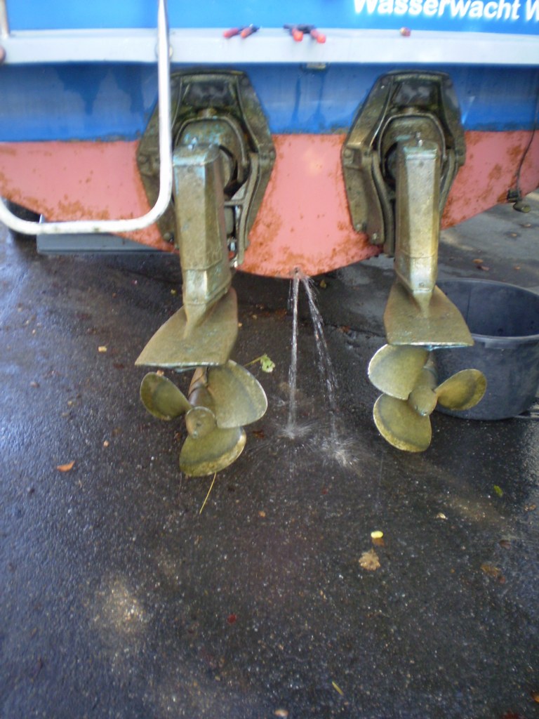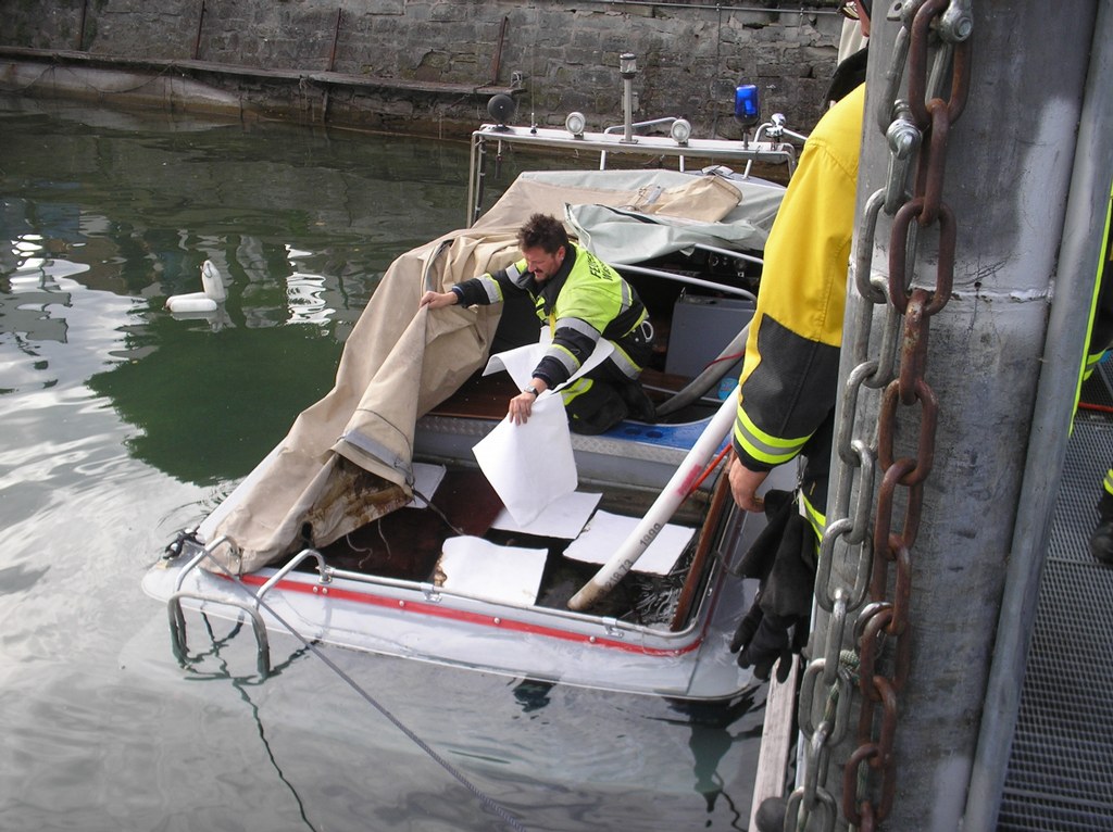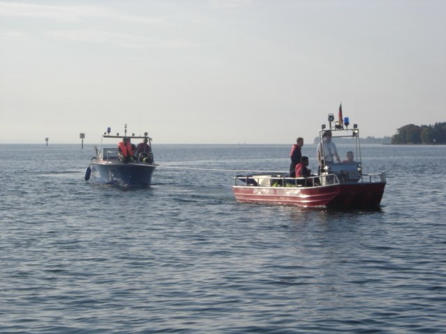 Mit Tauchpumpen wurde das Schiff wieder leer gepumpt. Die geringen Mengen an ausgetretenem Motoröl wurden mittels Ölbindevlies aufgenommen und entsorgt. Nachdem das Boot nun einen stabilen Zustand erreicht hatte, wurde es von unserem Mehrzweckboot ‚Richl’ zur ortsansässigen Werft geschleppt.