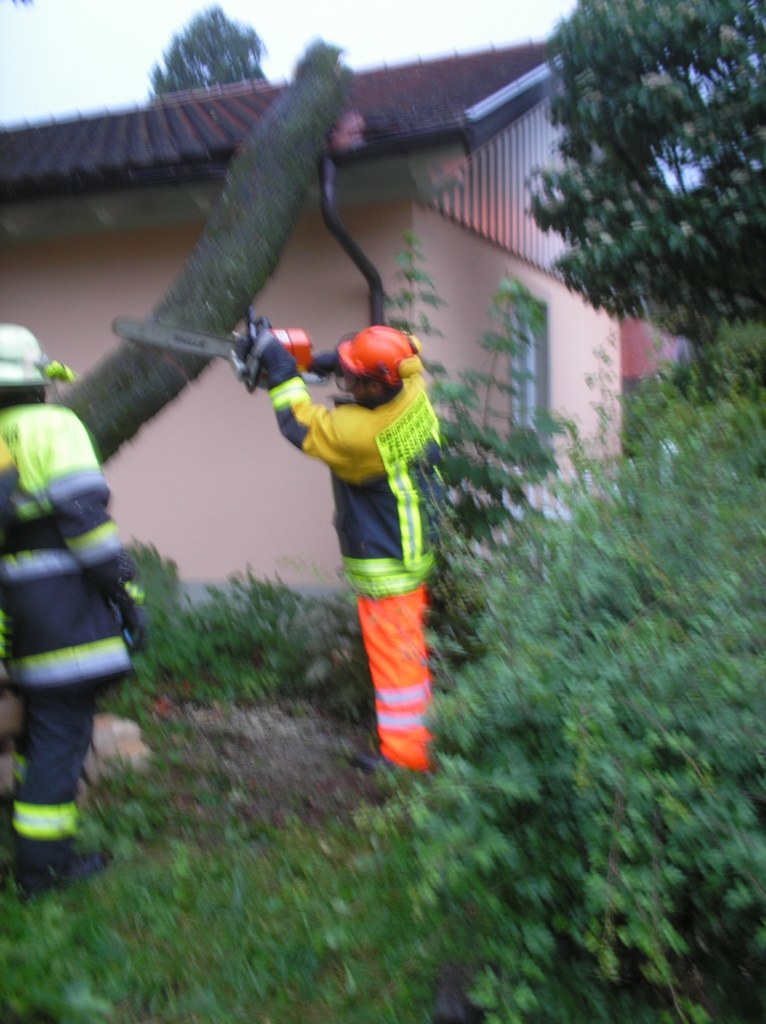 Nach einer kurzen Lageerkundung in der Uferstraße entschied er, dass die Feuerwehr zum Einsatz kommen muss. Da sich 8 Kameraden zu einem Dienst im Feuerhaus aufhielten, konnte das HLF mit 9 Mann ohne Alarmierung ausrücken. Nachdem wir die Einsatzstelle abgesperrt hatten, haben wir den Ast mit Hilfe der Motorkettensäge vom Garagendach geholt.