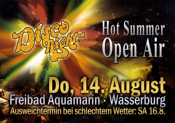 Auch dieses Jahr findet im Aquamarin Wasserburg eine DiscoNight statt. Am 14. August veranstaltet der Förderverein der Freiw. Feuerwehr Wasserburg ab 21:00 Uhr im Freibad Aquamarin die beliebte Open-Air Disco. Ersatztermin bei schlechtem Wetter ist Samstag, der 16. August.