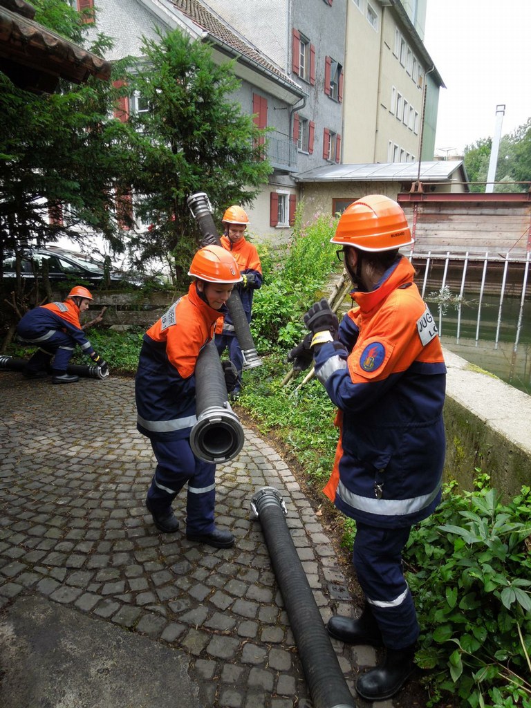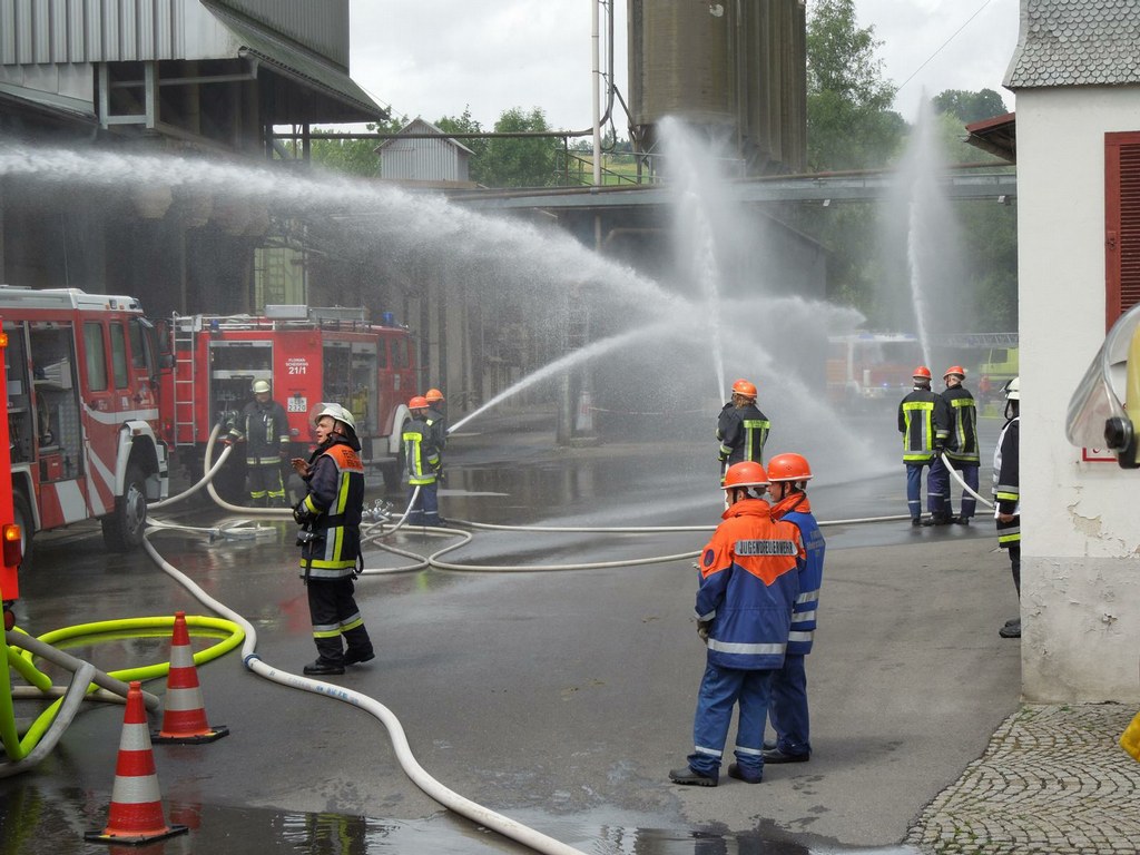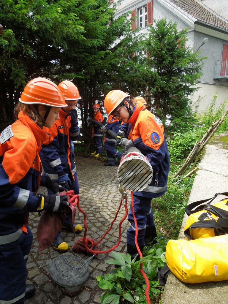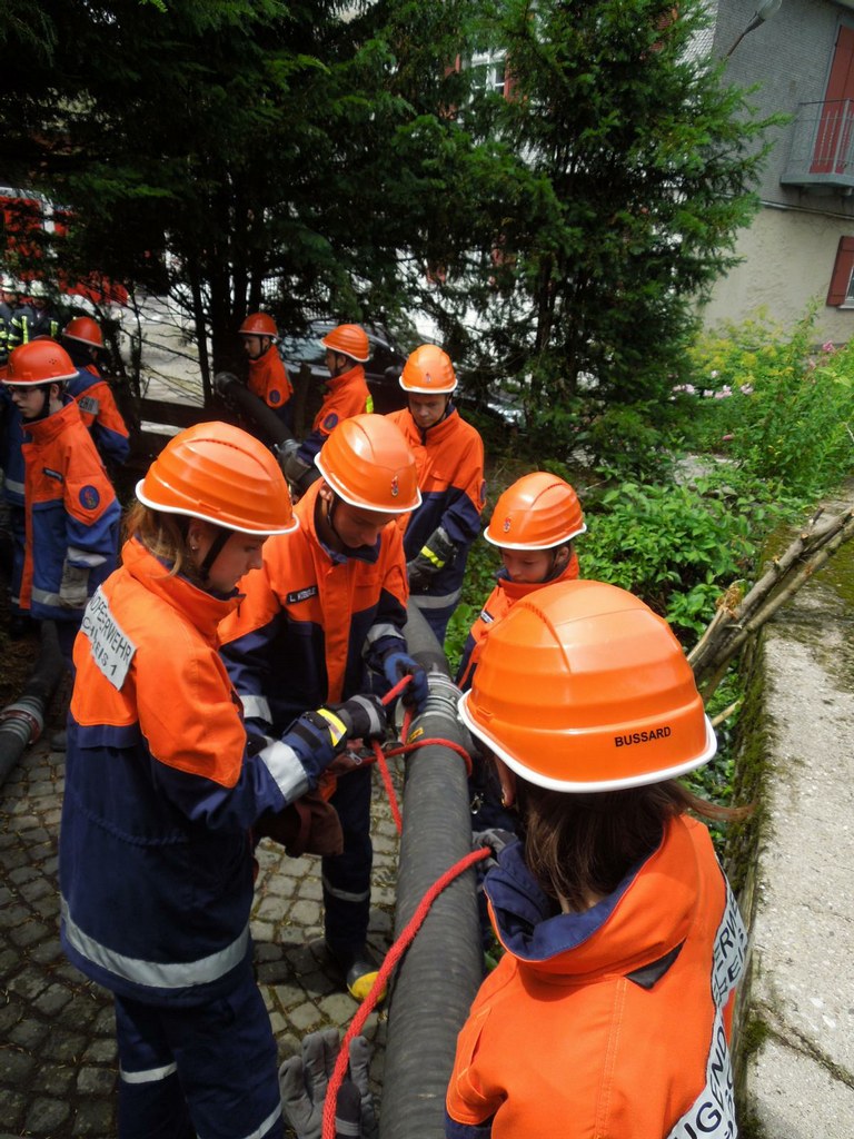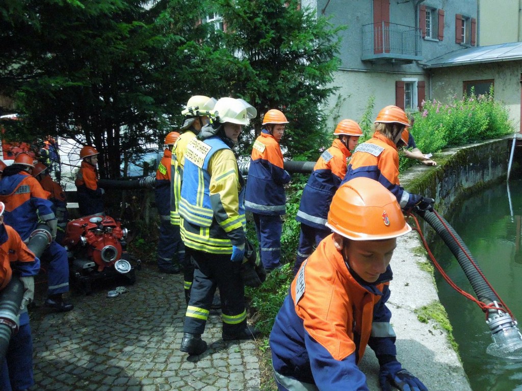 Während die einen suchten und retteten, machten sich die anderen ans Löschen. Mit Motorpumpen entnahmen die jungen Feuerwehrler Wasser aus der in der Nähe liegenden Argen. „Rund 6000 Liter Wasser in der Minute wurden zum Brandlöschen gefördert“ , erklärte Jugendleiter Fabian Schief aus Maria-Thann. Er hatte die Einsatzleitung inne. Gute Dienste leistete dabei der Wasserwerfer mit über 40 Meter Wurfweite der Feuerwehr Hergensweiler. Auch die Drehleiter der Feuerwehr Lindenberg war im Einsatz um dem „Brand“ von oben zu bekämpfen. Mit Hochdrucklüftern rückten die Einsatzkräfte gegen den „Rauch“ aus.