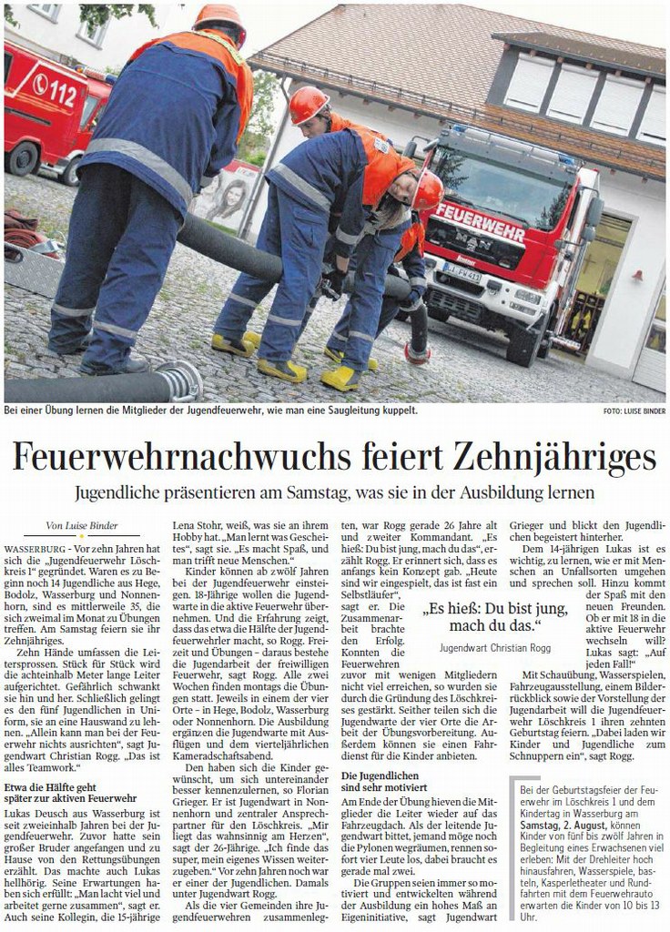 WASSERBURG - Vor zehn Jahren hat sich die „Jugendfeuerwehr Löschkreis 1“ gegründet. Waren es zu Beginn noch 14 Jugendliche aus Hege, Bodolz, Wasserburg und Nonnenhorn, sind es mittlerweile 35, die sich zweimal im Monat zu Übungen treffen. Am Samstag feiern sie ihr Zehnjähriges.