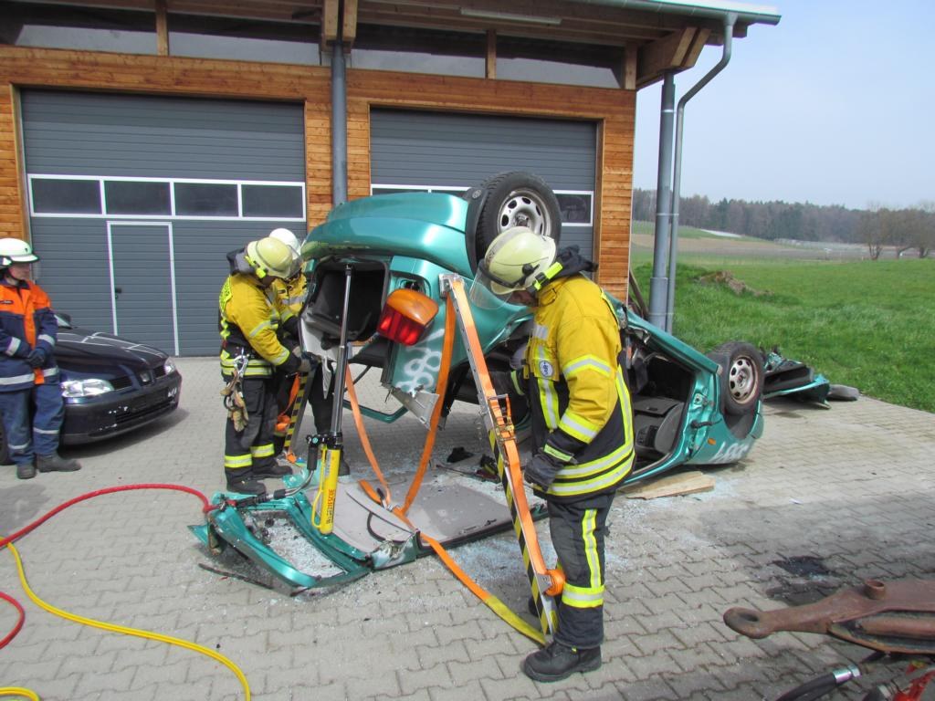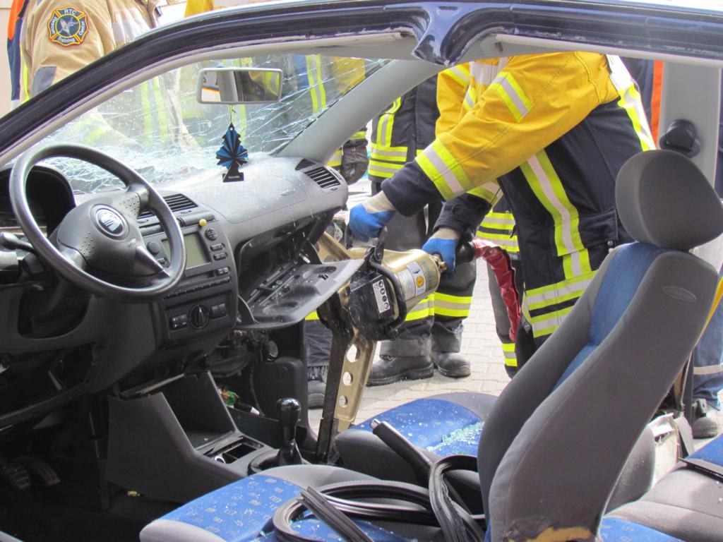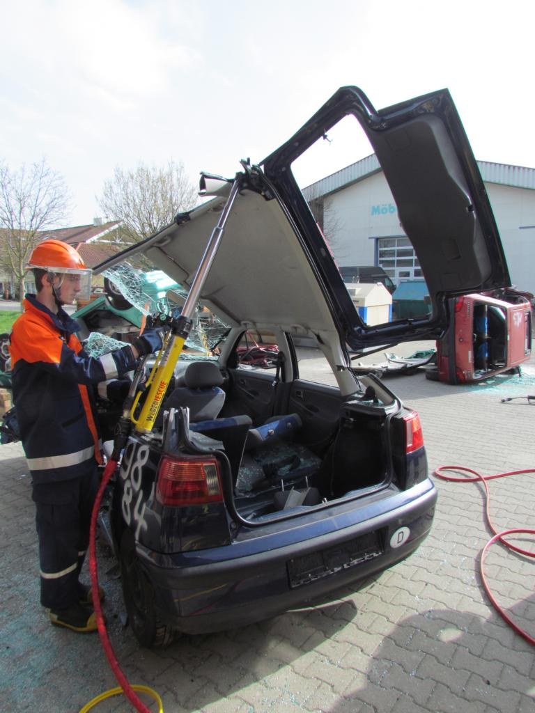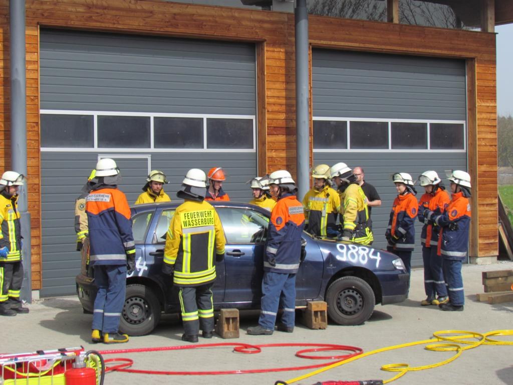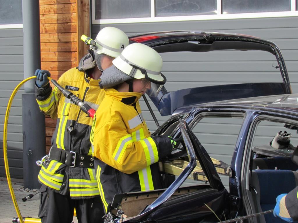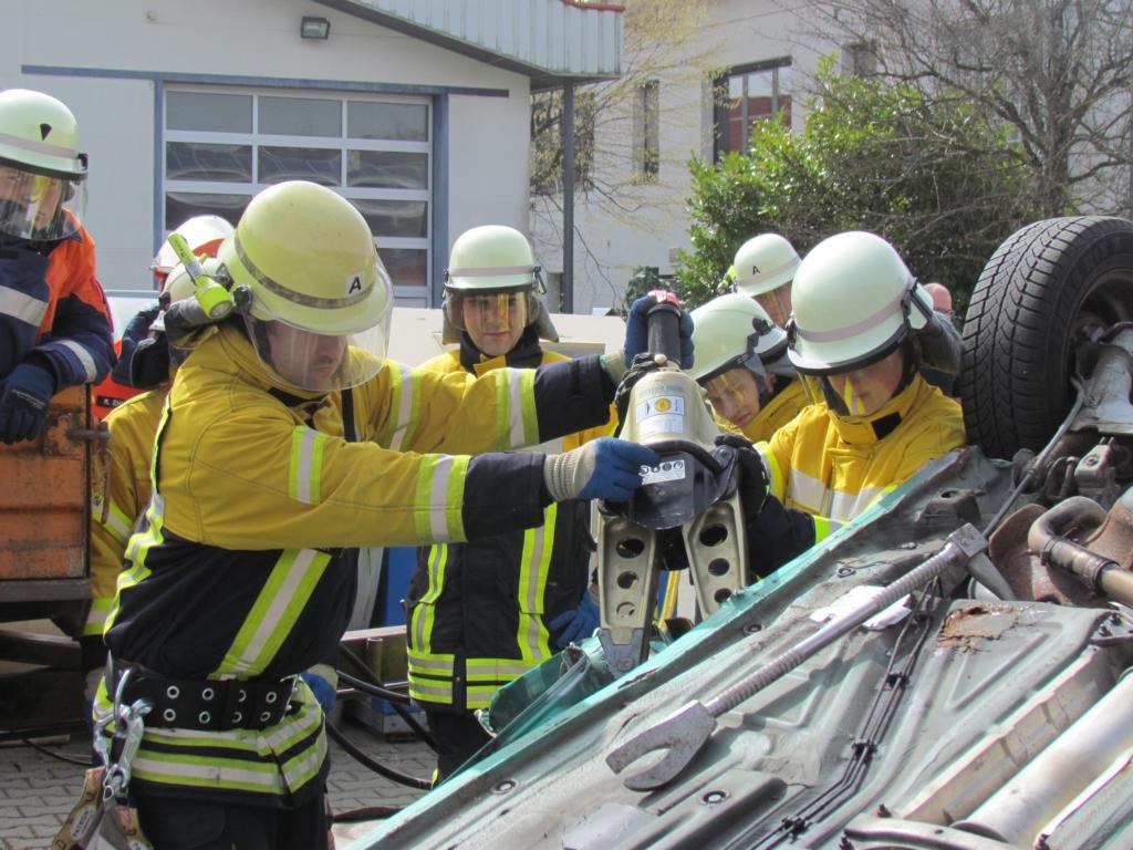 Mit einem externen Trainer erlernen die jungen Feuerwehrler Wasserburgs den Umgang mit Schere und Spreizer bei der technischen Hilfeleistung bei Verkehrsunfällen.