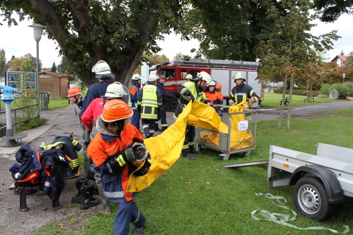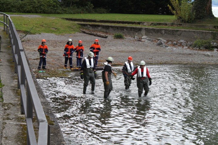 Kaum gestärkt durch Curry-Wurst mit Pommes wurden die Jugendlichen aus ihrer Erste-Hilfe Schulung gerissen und zum nächsten Einsatz gerufen. Dieses Mal hieß es allerding "Hier Leitstelle mit Einsatz für Jugendfeuerwehr Löschkreis I – Technische Hilfeleistung Gewässerverunreinigung." Hier galt es eine Verunreinigung auf dem Bodensee direkt an der Anlegestelle in Nonnenhorn in den Griff zu bekommen. Dabei mussten die Jugendlichen Ölsperren einbringen, ein Fangbecken bauen und dass "Verunreinigte Wasser" abpumpen. Nach gut 1,5 Stunden hieß es dann vom Einsatzleiter: "Verunreinigung erfolgreich beseitigt!"