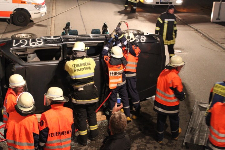 Noch während die Betreuer die Jugendlichen gegen 22:00 Uhr auf die anstehende Nachtruhe aufmerksam machten, ertönte bereits der nächste und somit 5 Hausalarm. Dieses Mal lautete die Einsatzmeldung "Technische Hilfeleistung – Fahrzeugbrand" bereits auf der Anfahrt stellte sich heraus, dass zwei Fahrzeuge zusammen gestoßen sind und dabei das eine auf der Seite lag. Hier galt es nun den dreifachen Brandschutz – Wasser, Pulver, Schaum - sicherzustellen und die 6 Unfallbeteiligten mittels Rettungsschere und Spreizer aus den Fahrzeugen zu befreien. Nach rund 1 ½ Stunden konnte die Straße wieder freigegeben werden und die Jugendlichen zur wohlverdienten Nachtruhe einrücken. An dieser Stelle bedanken wir uns recht herzlich bei der Autoverwertung Stark aus Lindau für die kostenlose Bereitstellung der Fahrzeuge.