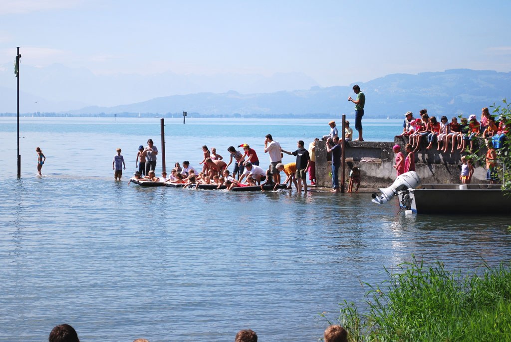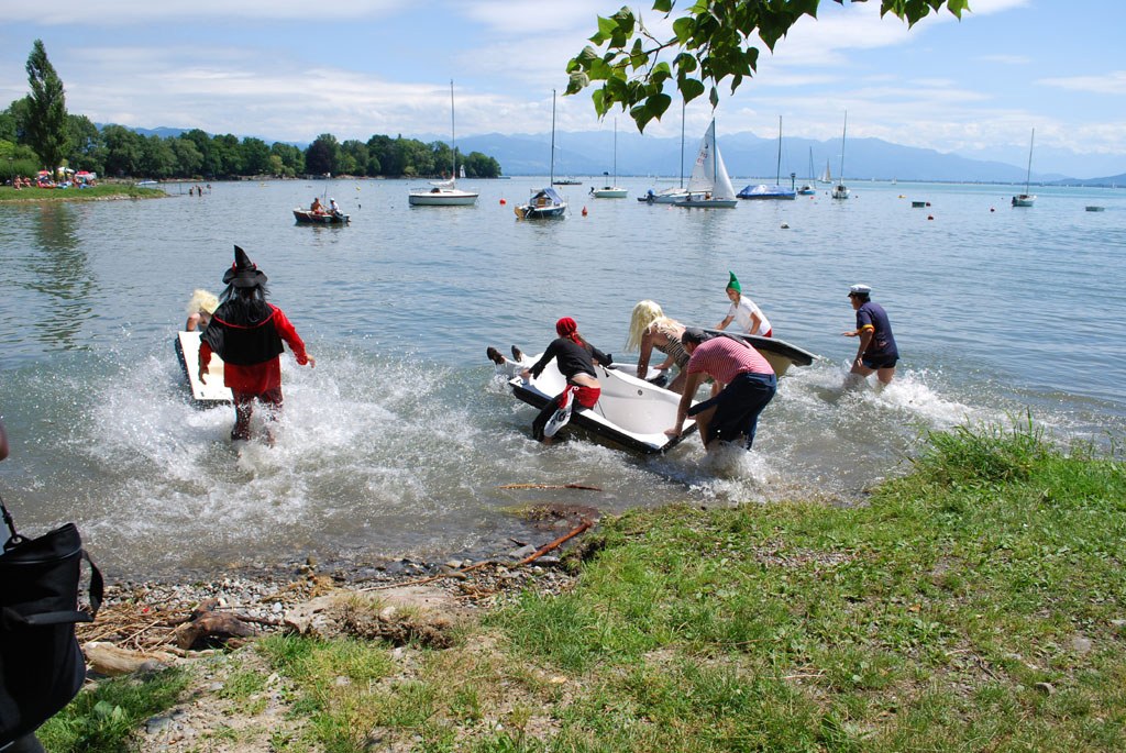 "Da haben wir was losgetreten. Das wird wohl eine bleibende Einrichtung in Wasserburg werden", freuen sich die beiden Organisatoren Philipp Kritzler und Dominik Tränkle, die im Wechsel das Badewannenrennen moderieren und mit ihren frechen Sprüchen für zusätzliche Heiterkeit im Publikum sorgen. Über zweihundert Zaungäste stehen zeitweilig am Bodenseeufer neben der Eschbachmündung. Und alle sind begeistert und loben die Idee immer wieder.