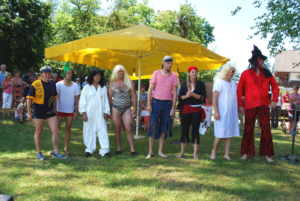 Jedoch: Was vorne gut rudert, schaufelt hinten viel Wasser in die Wanne - und das muss dann mitgeschleppt werden. "Wenn die Wanne leer ist, läuft sie wie die Hex, aber sobald sie voll ist, geht gar nichts mehr", erzählt Initiator Philipp Kritzler von seinen Erfahrungen. Er sitzt als sexy Pamela gemeinsam mit Manfred Starke als Team "Bay Watch" in der Wanne. Die beiden werden am Ende die zweiten Sieger sein.