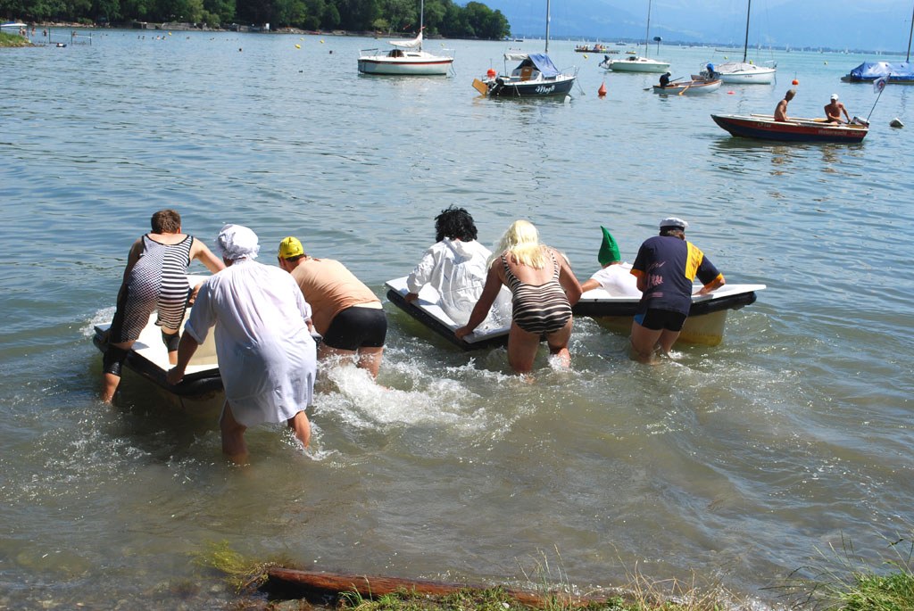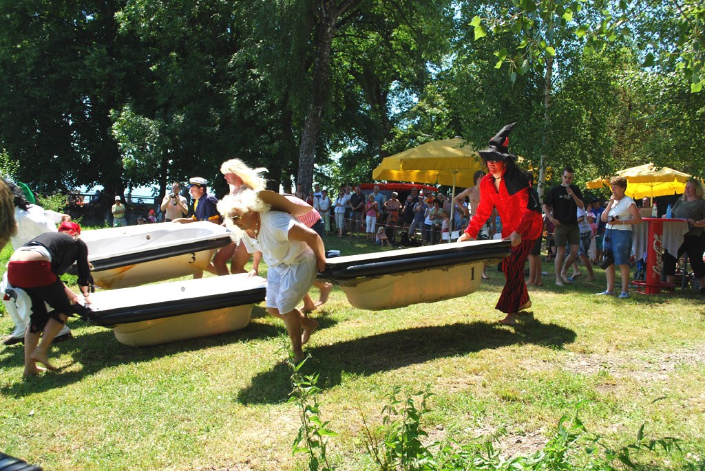 Badewannen schwimmen wirklich, aber sie haben einen enormen Tiefgang. Das merken die Teilnehmer des Badewannenrennens sehr schnell. Als Engel und Teufel vom "Himmel und Hölle", "Unsinkbar", "Bay Watch"... treten sie an, das einzige Damenteam heißt "Hot & Spicy" und sieht auch so aus. Mit einem sogenannten Lemont-Start rennen die Zweier-Teams auf Kommando los, tragen ihre Badewanne zum Wasser, werfen erst die Wanne hinein, dann sich hinterher und paddeln schließlich mit den Händen, wie von einem Turbo angetrieben durch das Wasser.